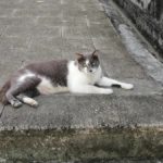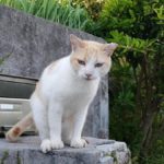 南風原町兼城の急勾配の坂道の途中にある民家の壁の上で、ツートンカラーのおニャン子に「ニャ~オ」と、挨拶すると、おニャン子も「ニャ~オ」と返事...