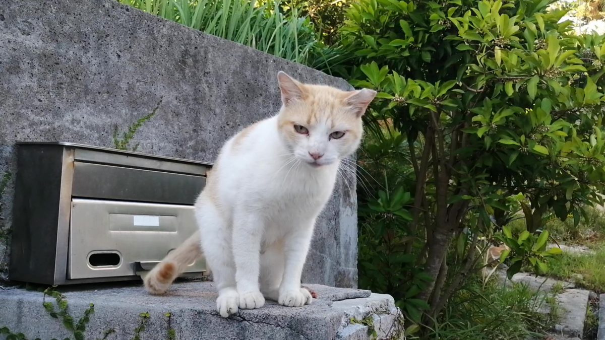 崎山ハイツ内のとある民家の門柱に鎮座するおニャン子を見つけ、カメラを回しながら近づいていくと、人馴れしているおニャン子のようで、なでてマッサージをしてあげると喜んで「ニャー」していました。
