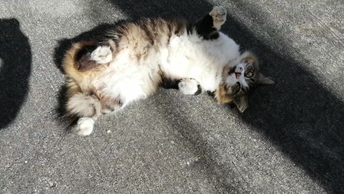 頭をなでて、マッサージをしてあげると、喜んで、コンクリーの上でゴロンゴロンと楽しそうな仕草をしていました。