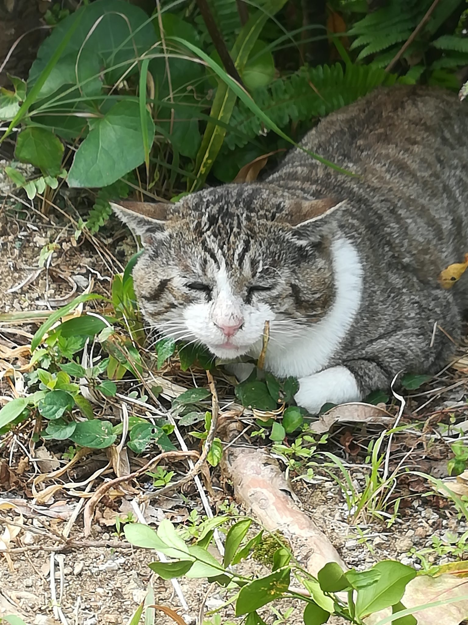 2017年12月15日10時過ぎ、ときおり陽が射す薄曇りの中、道路脇の草むらで暖を取っているおニャン子に遭遇しました。