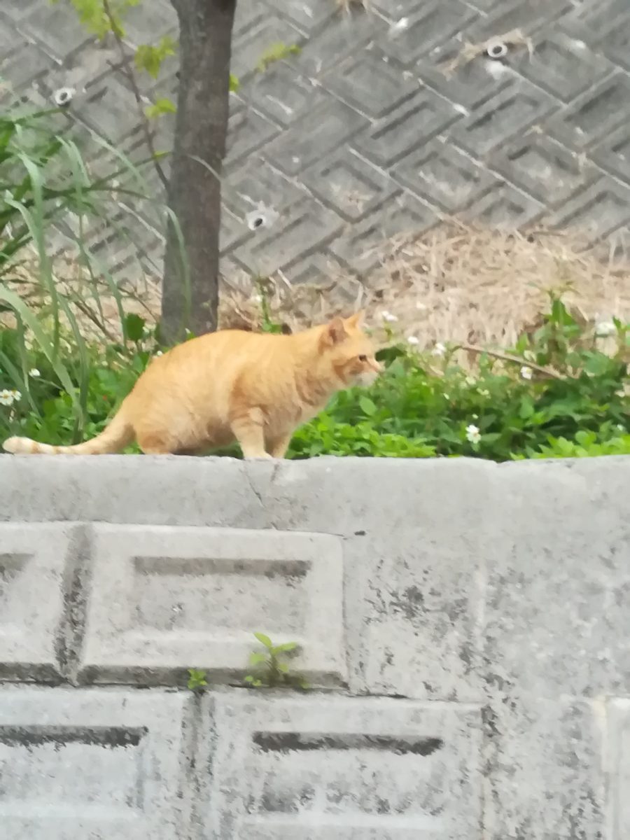 早朝の崎山ハイツ、首里カトリック幼稚園の下の道を歩いていると、土手の上に茶色のトラを発見。