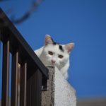 崎山ハイツ・おニャン子クラブ 会員番号18番 2Fにある、コンクリートのベランダの手すりの隅に座り、こちらの様子を不思議そうな趣で見る...