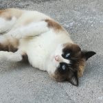 朝の散歩をしている際に、シャンさんを駐車場付近で発見。 「にゃ~お」と挨拶をすると、コンクリートの上でゴロンゴロンし始めた。 背中が痒い...