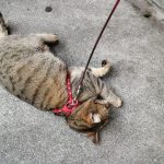 那覇市上間の車がしばしば通る小道のアパートの駐車スペースに、リードで繋がれているおニャン子を発見。 あまり人が通らない道で、おニャン子...