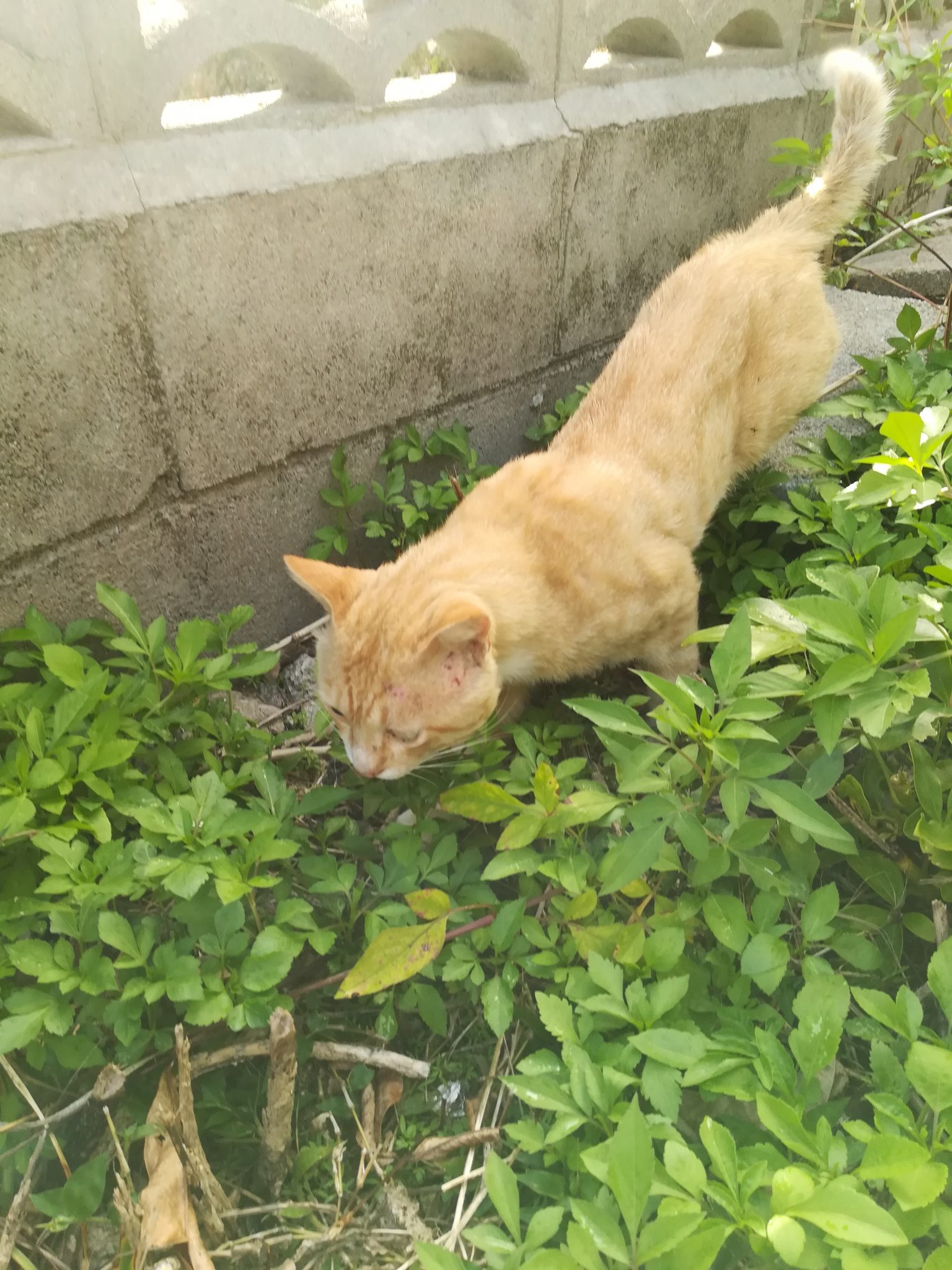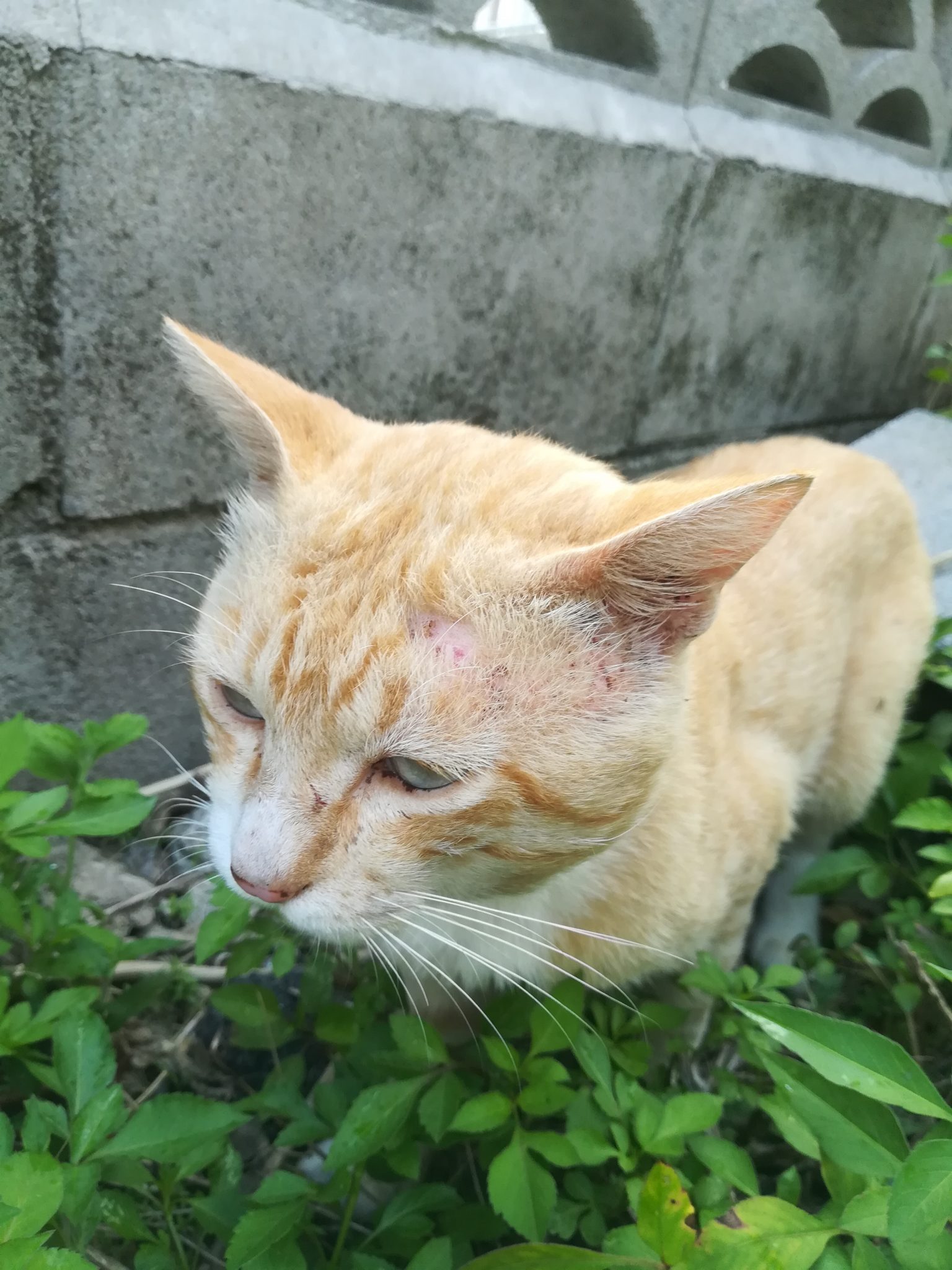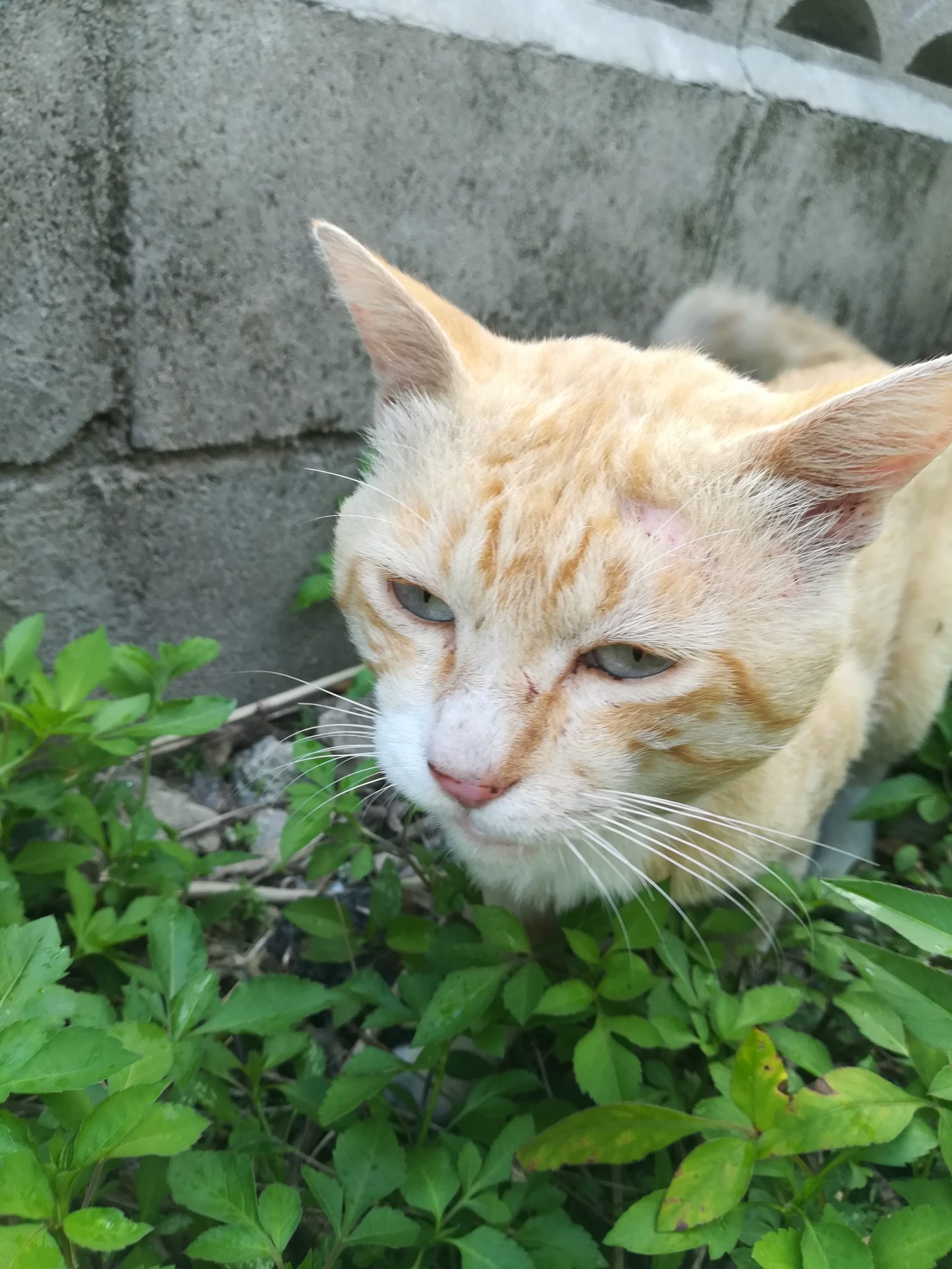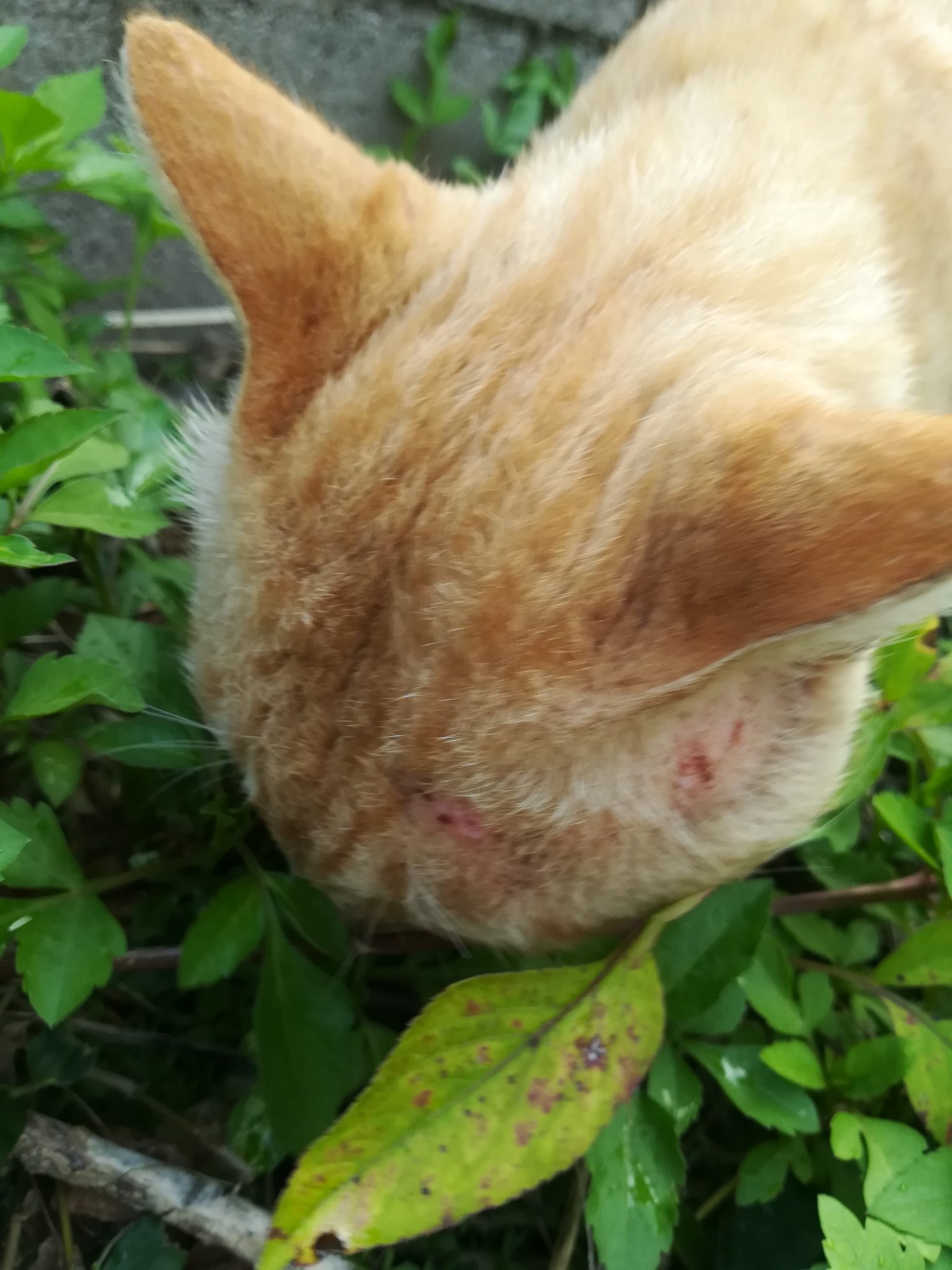 頭部にケガ?のあるおニャン子 2018/7/16 2018/8/27 崎山ハイツのおニャン子 崎山ハイツの中をいつものように散歩をしていたら、茶色のすこし年をとったおニャン子に遭遇しました。 近寄っても逃げることはなく、かと言って、おべっかを使うわけでもなく、自分のやりたいように動いていたおニャン子でした。 近づいてよくみてみると、耳のたもとあたりに怪我か皮膚病になっていました。