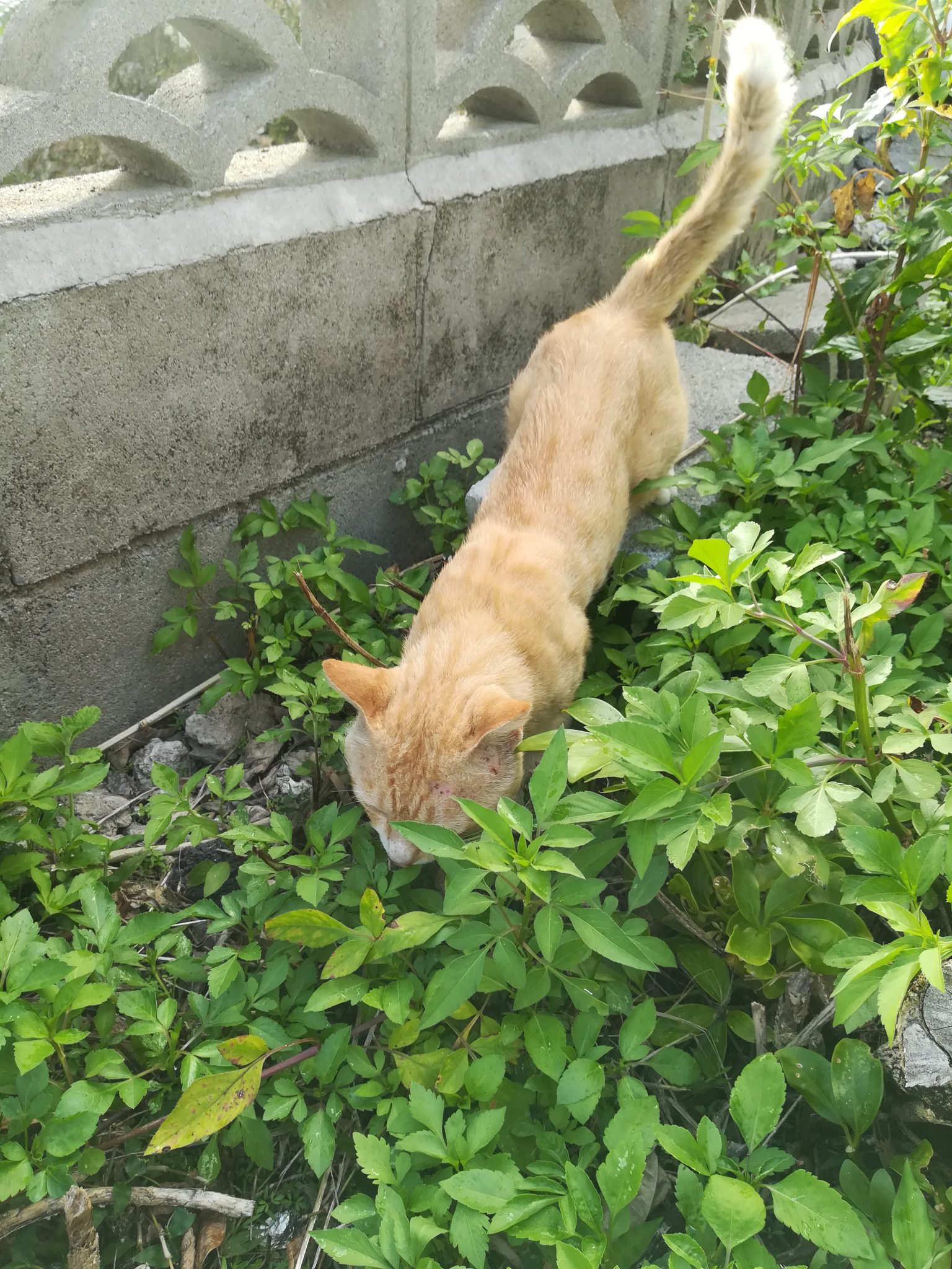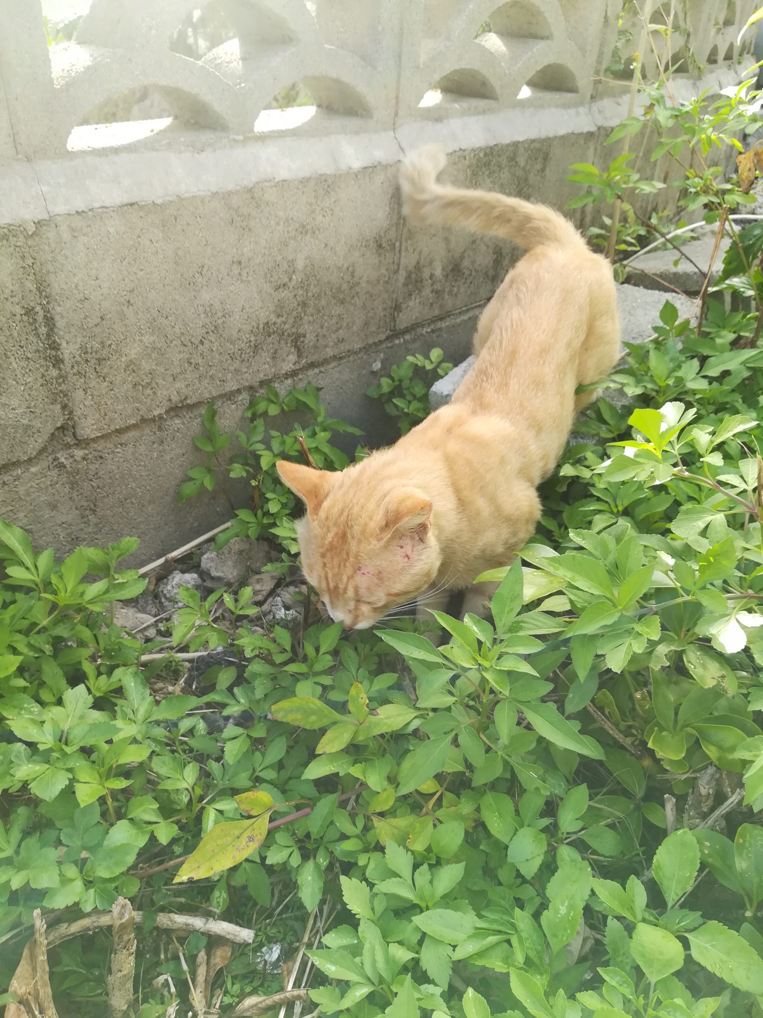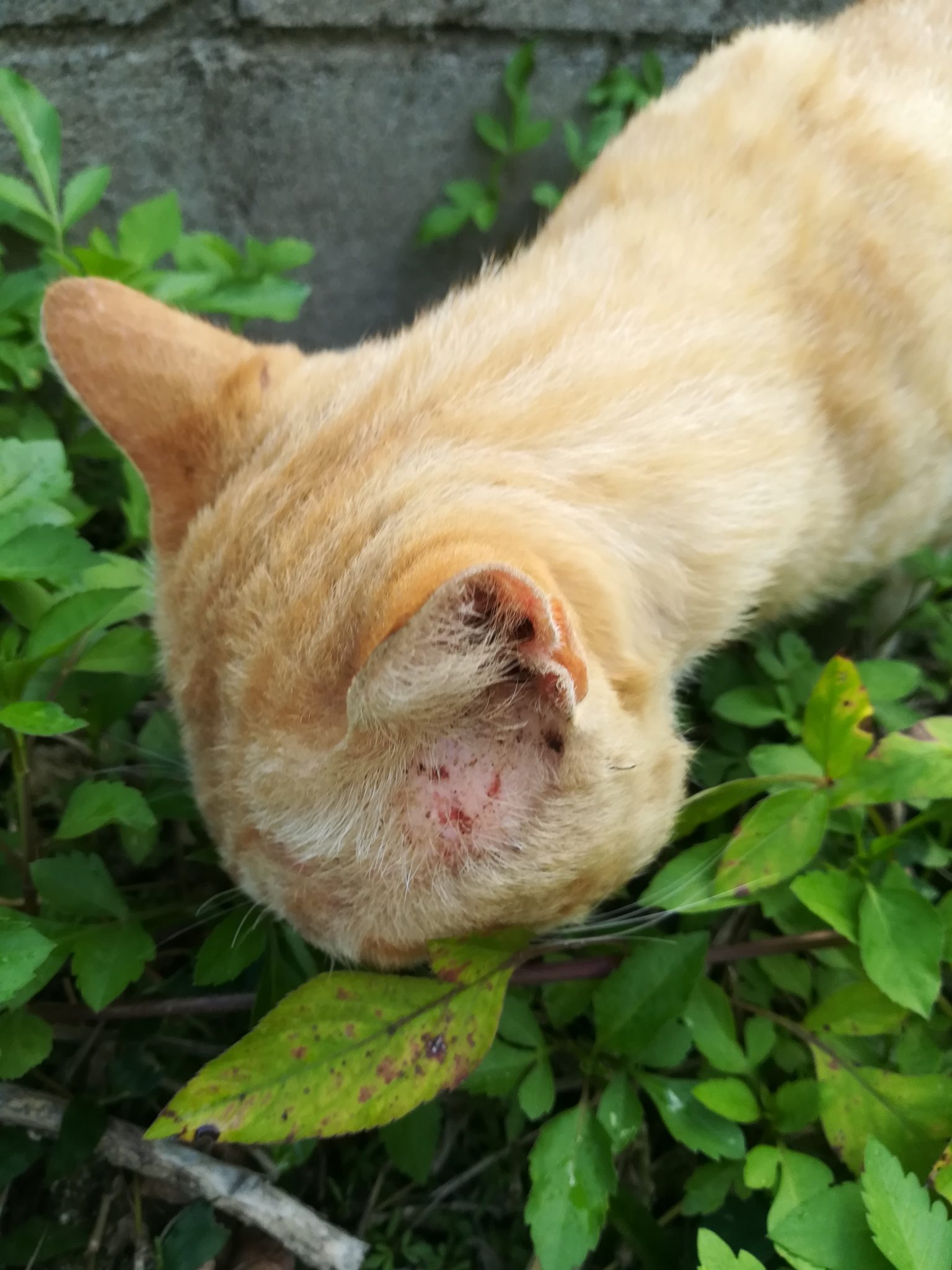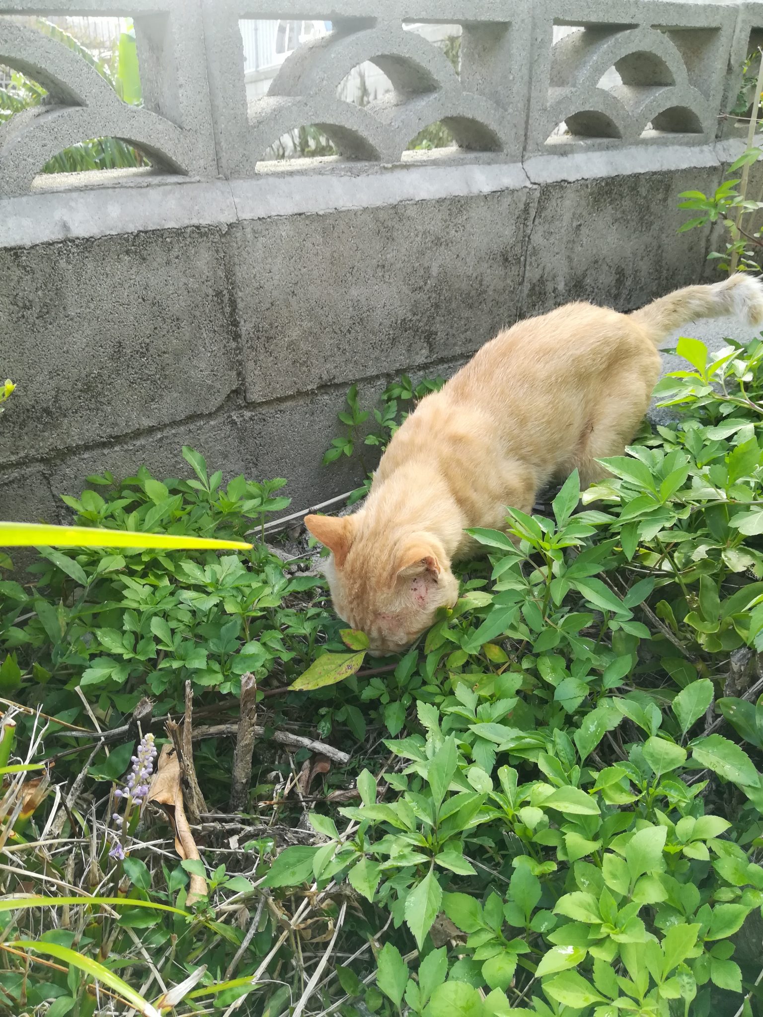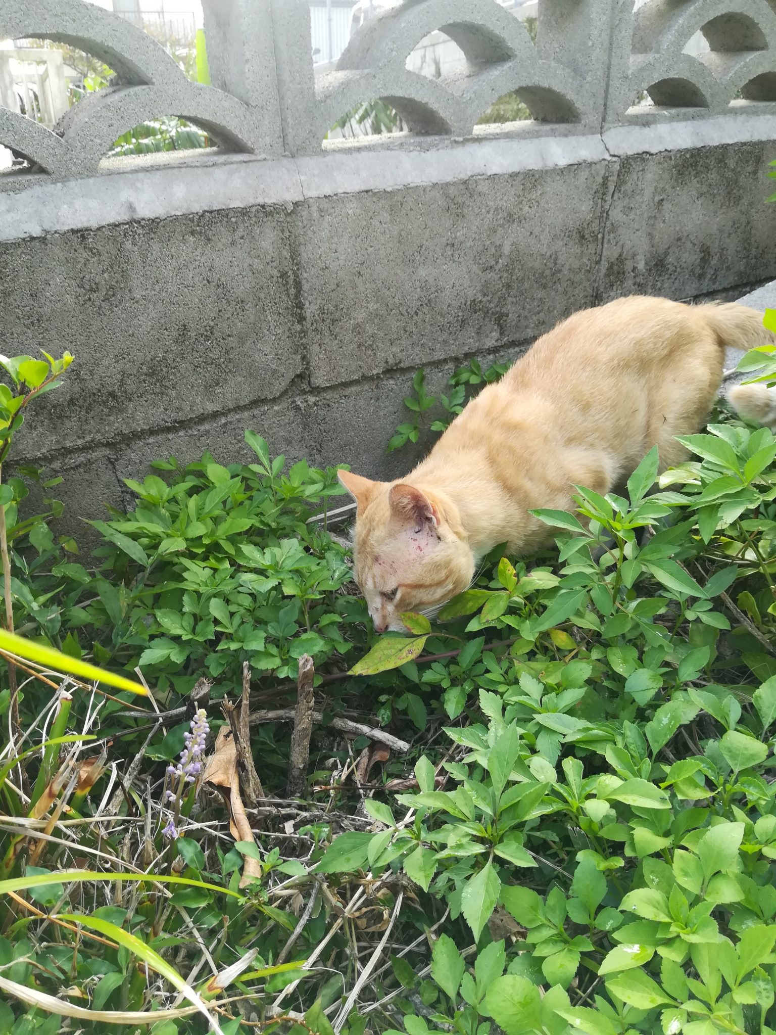 頭部にケガ?のあるおニャン子 2018/7/16 2018/8/27 崎山ハイツのおニャン子 崎山ハイツの中をいつものように散歩をしていたら、茶色のすこし年をとったおニャン子に遭遇しました。 近寄っても逃げることはなく、かと言って、おべっかを使うわけでもなく、自分のやりたいように動いていたおニャン子でした。 近づいてよくみてみると、耳のたもとあたりに怪我か皮膚病になっていました。