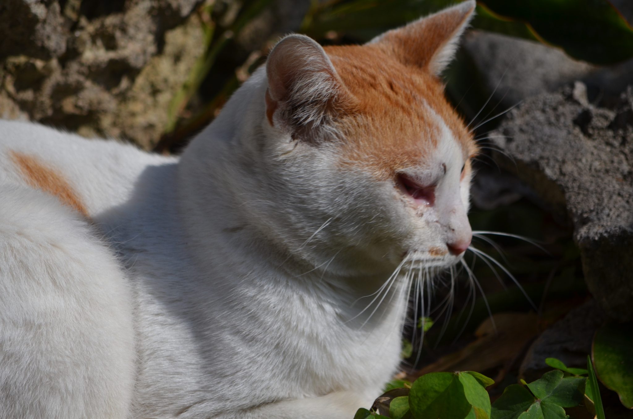 道路の端の土手の上で日向ぼっこをしている、茶色と白のニャンコを発見。