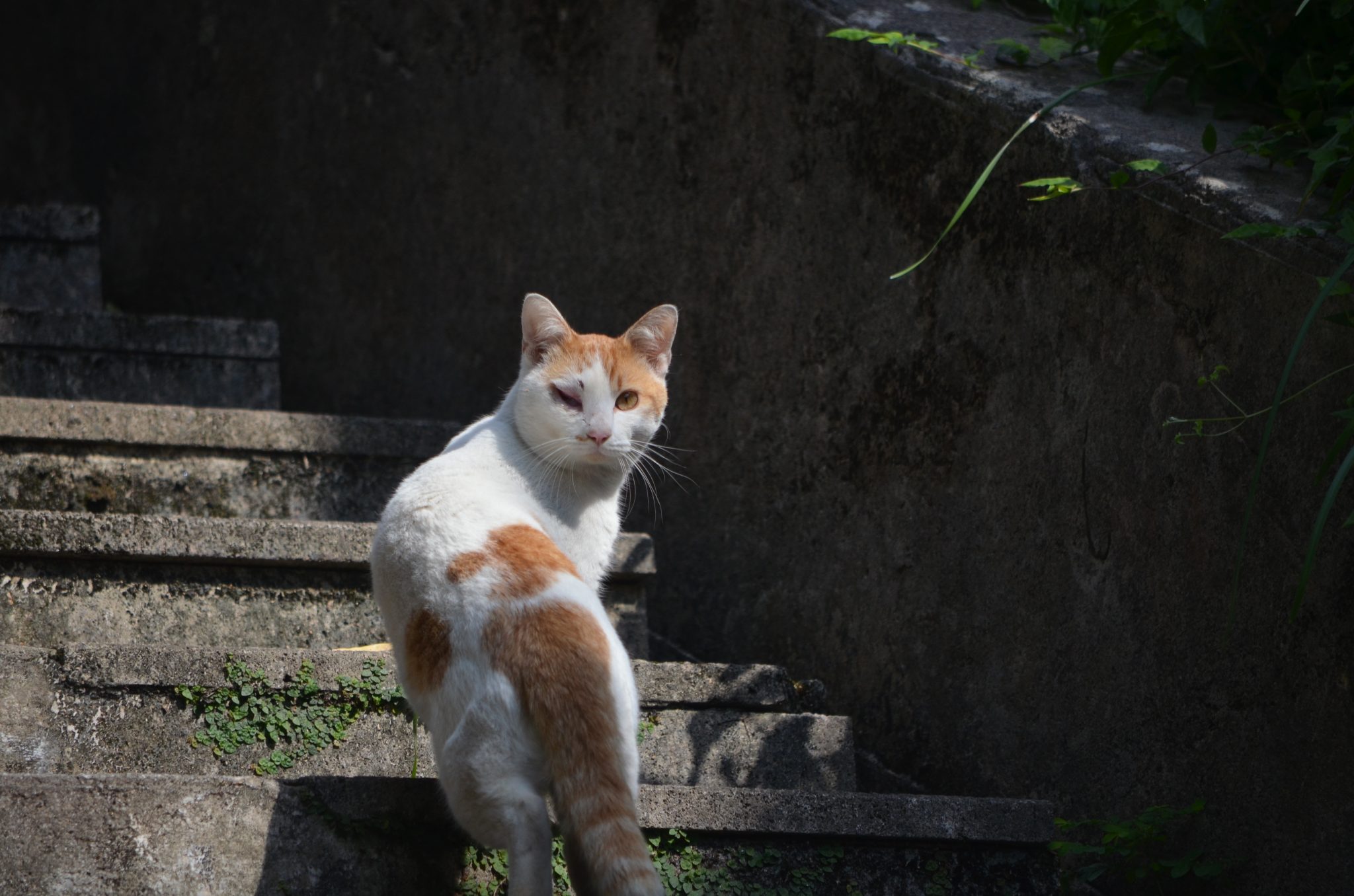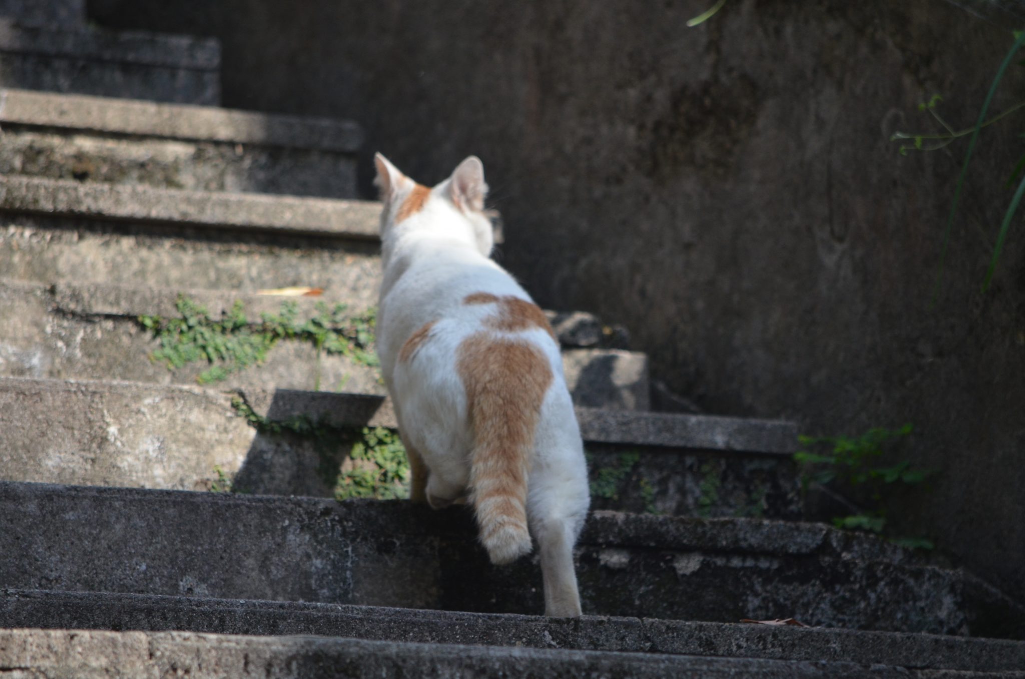 近寄っていくと、警戒心が強いのか、高台へ移動し、側の階段を登っていく。安全だと思われるところまで来ると、振り向いて、こちらの様子を伺った。