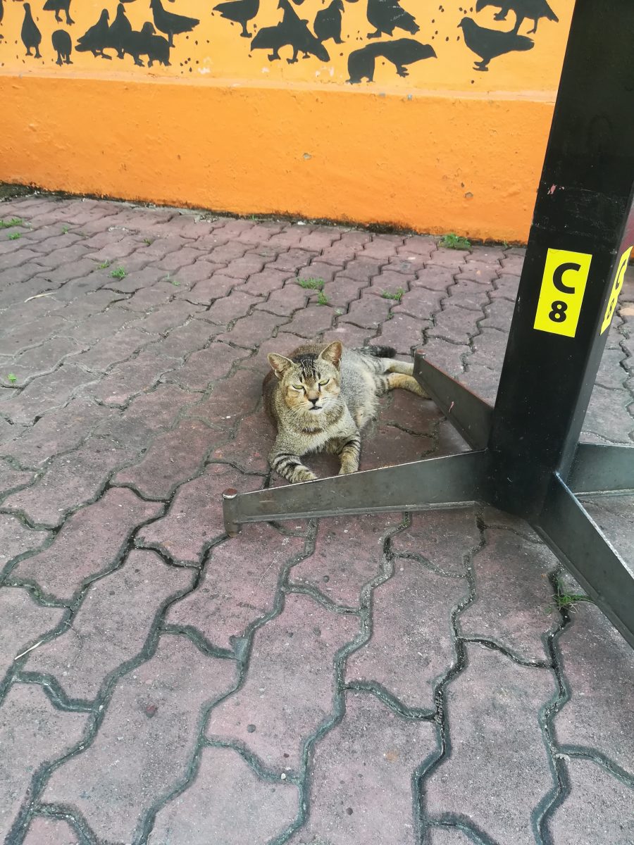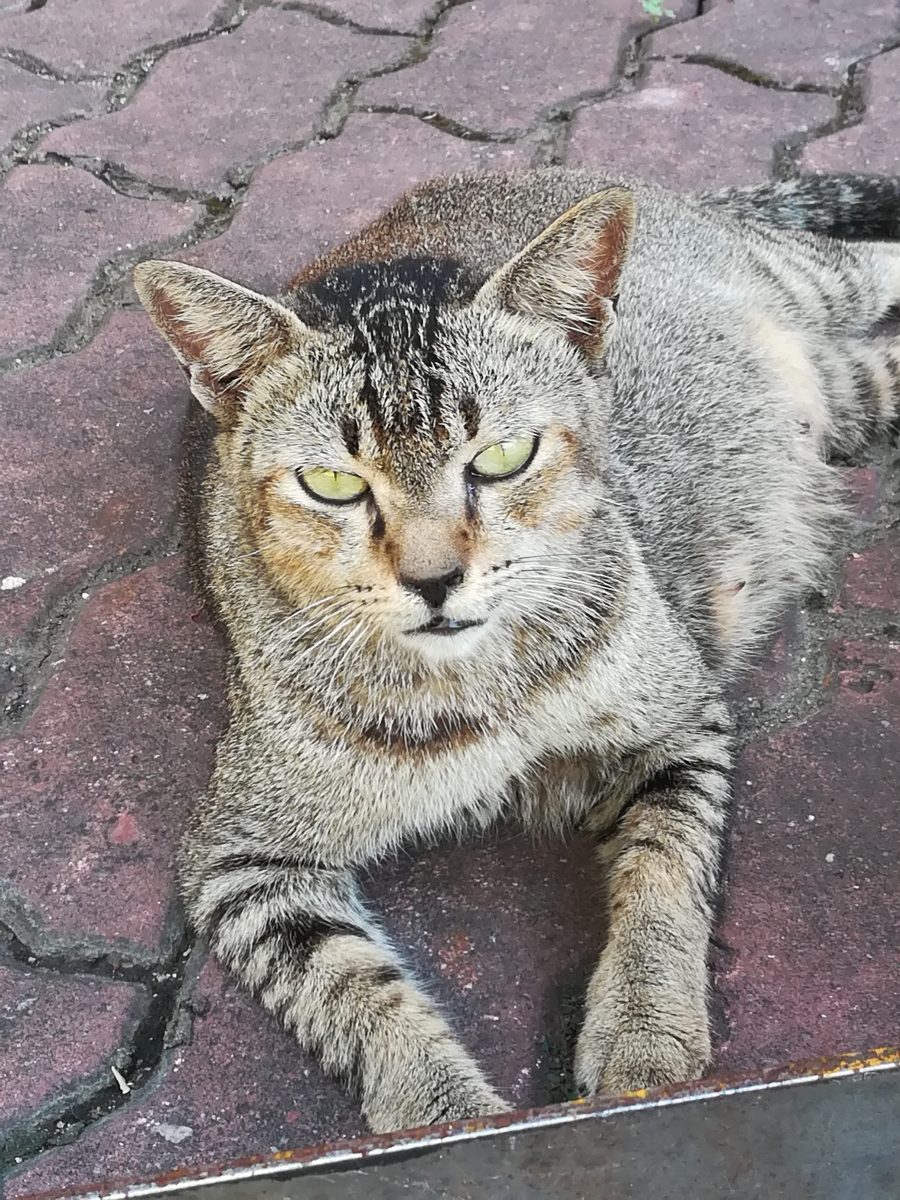 2018/8/7 2018/10/16 マレーシア・マラッカ マレーシア・マラッカの町の中を散歩している時に出会ったおニャン子です。 歩道上にあるテーブルの下に座って、こちらを見ていました。 客寄せのおニャン子かな?
