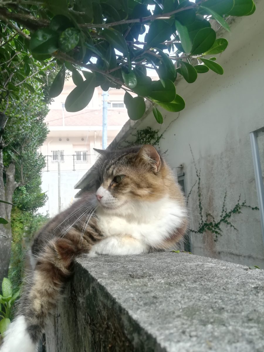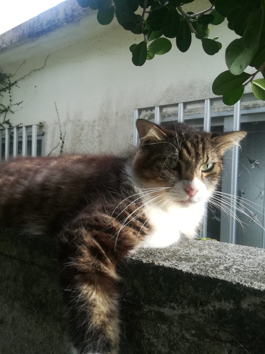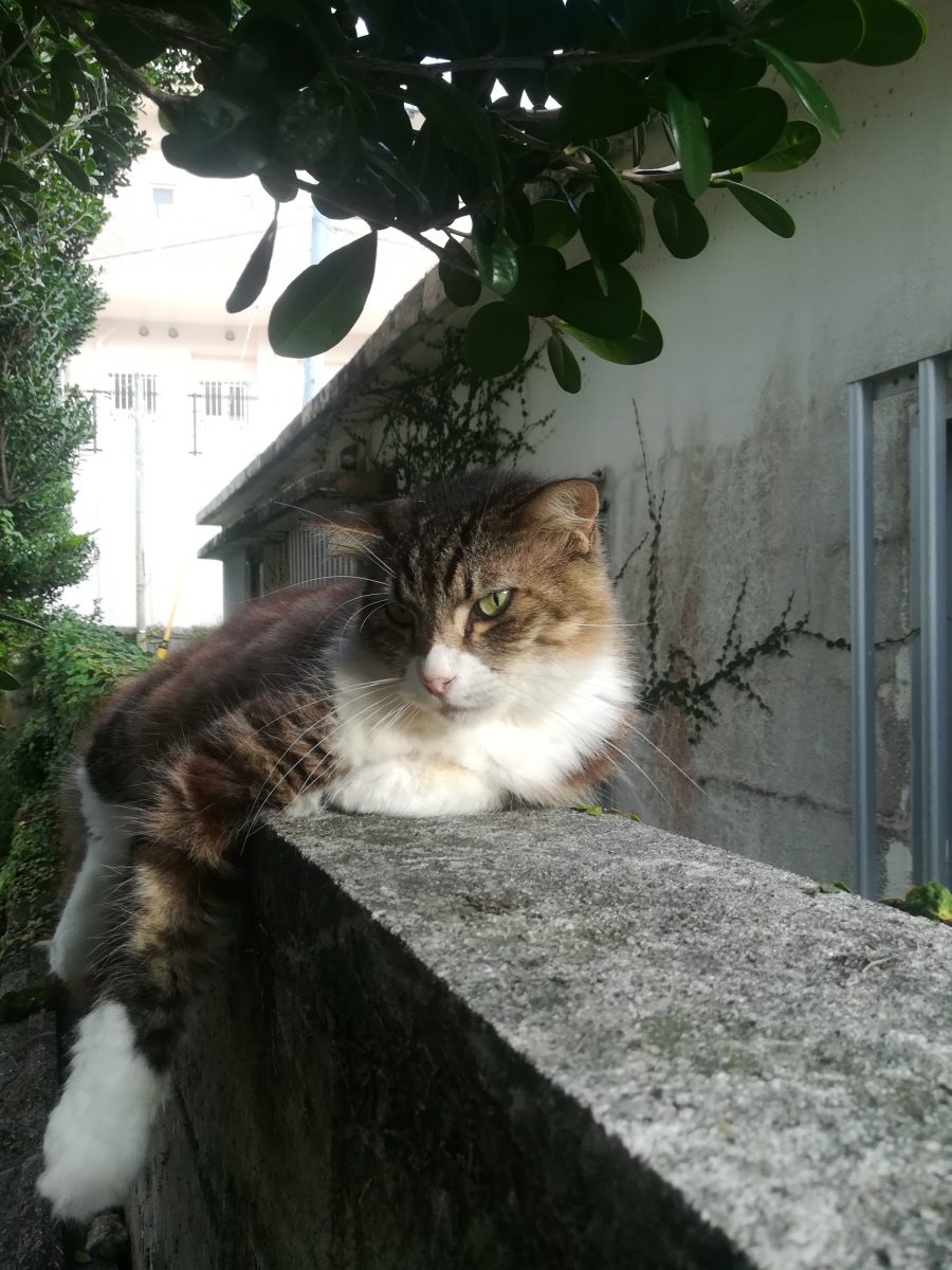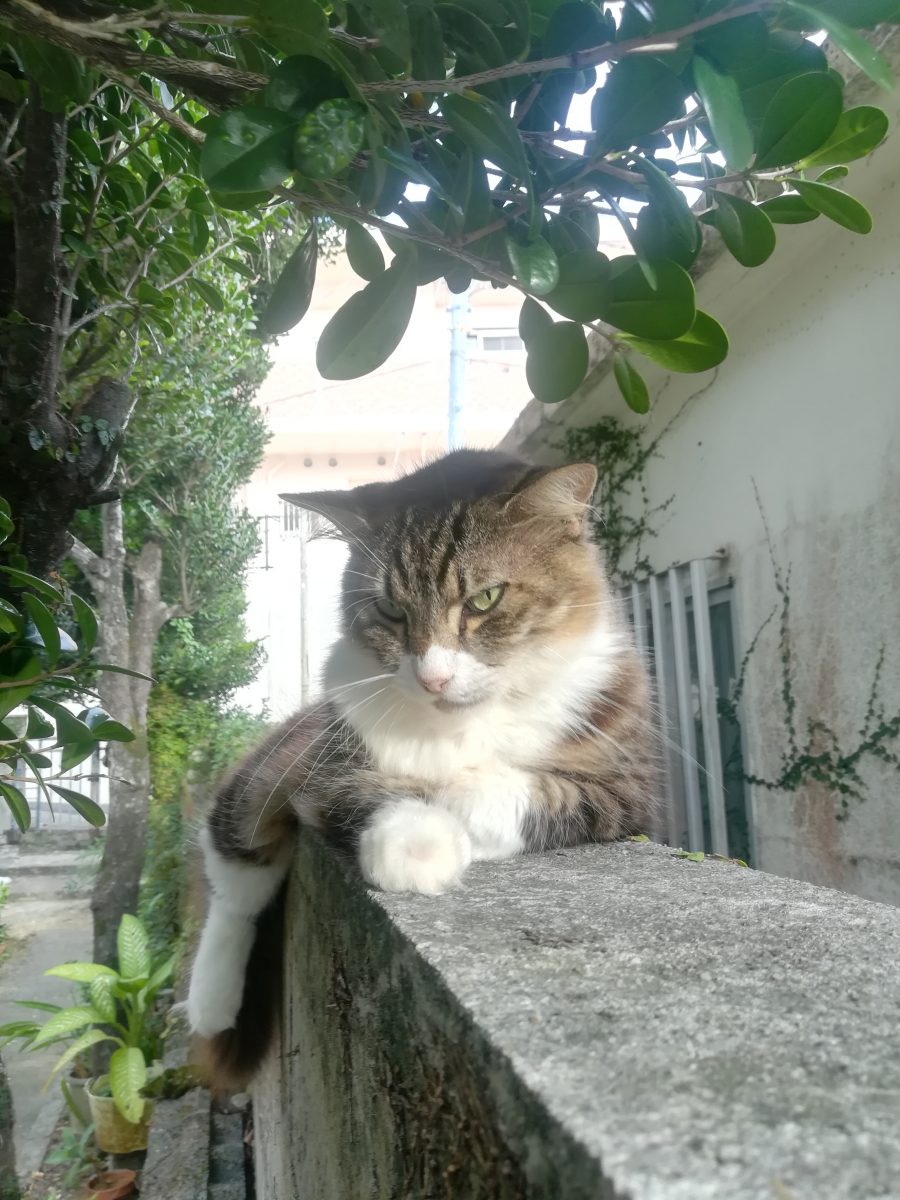 塀の上がお気に入り 2018/8/22 2018/10/22 上江洲そろばん塾のおニャン子 上江洲そろばん塾の庭で、このおニャン子を見るときは、いつも、この塀の上だ。 ここが、こいつのお気に入りの場所なのかもしれません。 このおニャン子、気が強いのか、近寄っていっても逃げません。 近寄りすぎると、「シャー」と、言って威嚇してきます。 また、あたまをなでようとすると、猫パンチが飛んできそうで、怖いです。