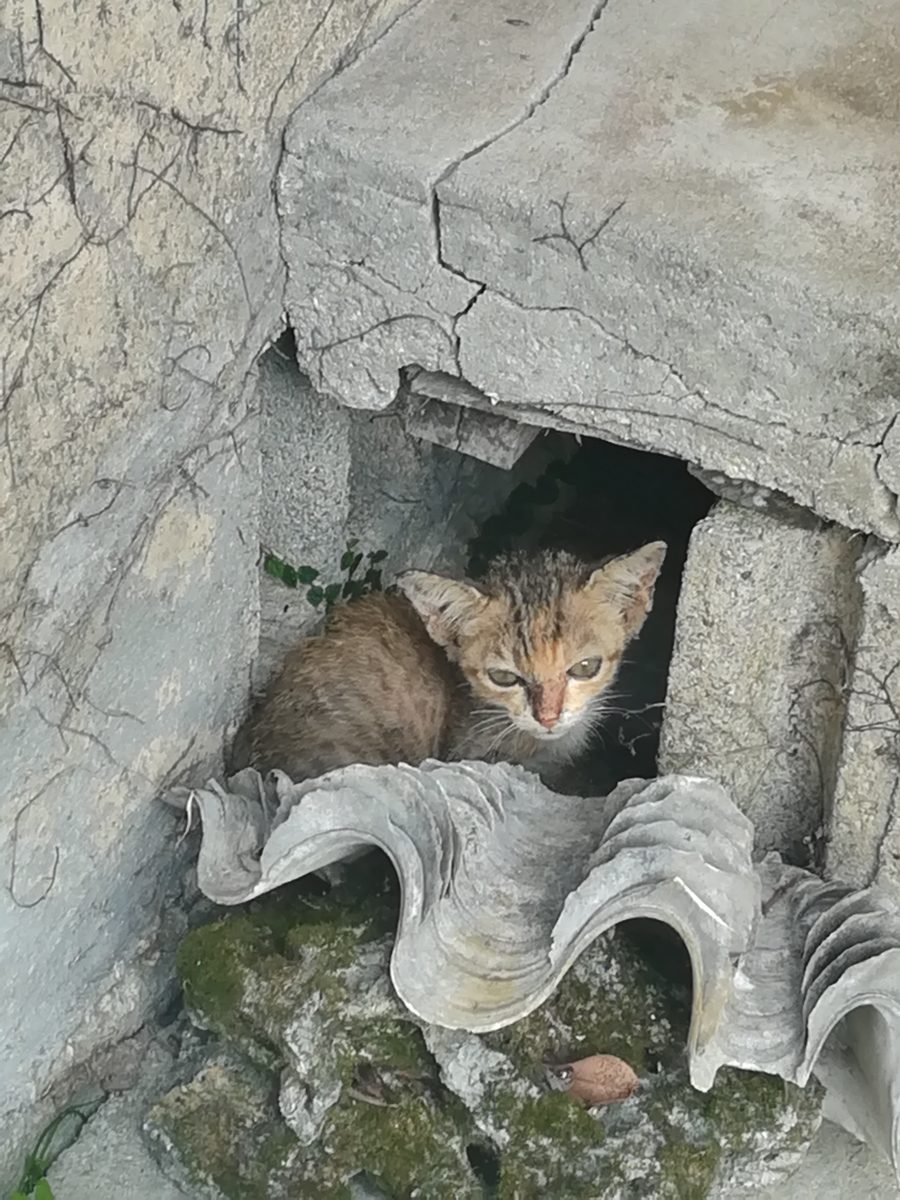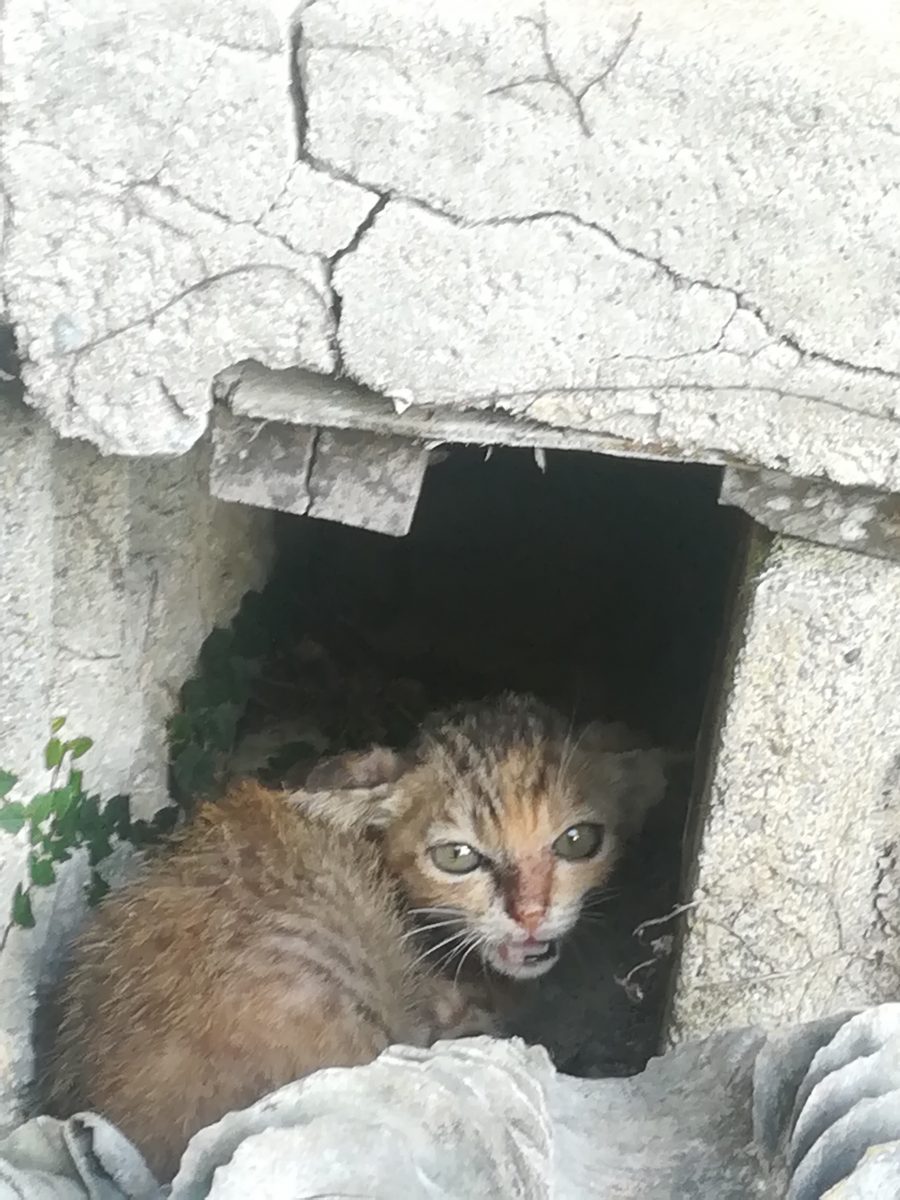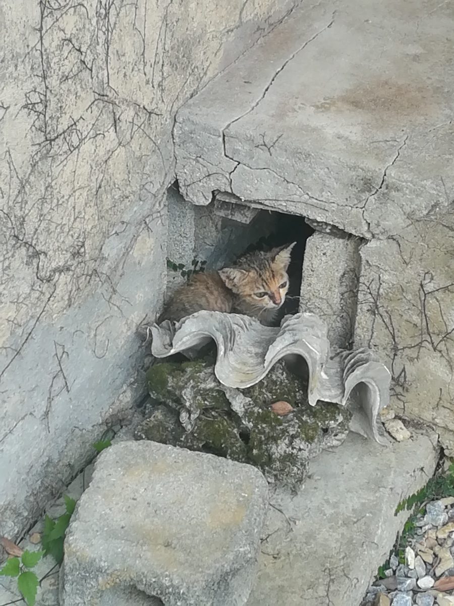 か弱い声で親を探すように、「ニャーニャー」泣いていたので、どこにいるのかと探したら、コンクリートでできた階段下の隙間にいました。