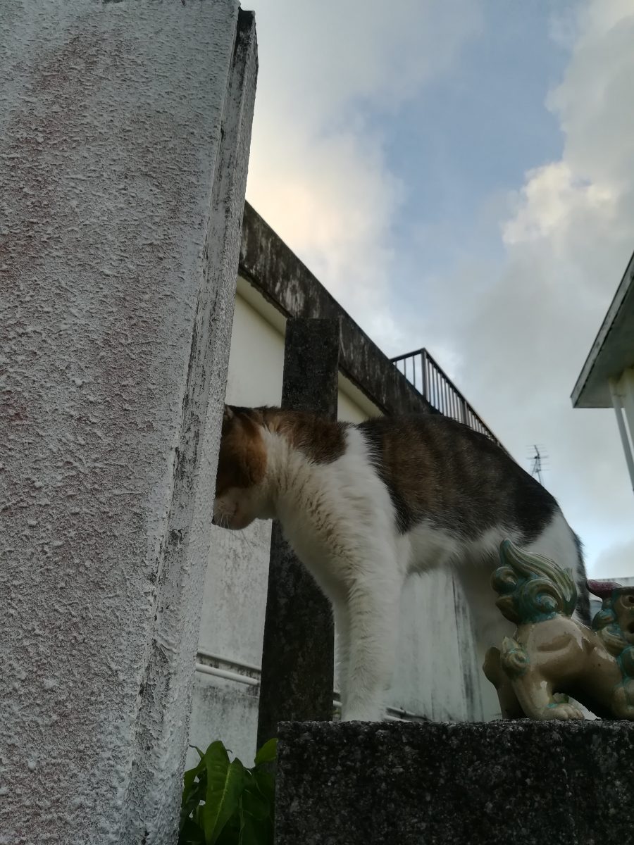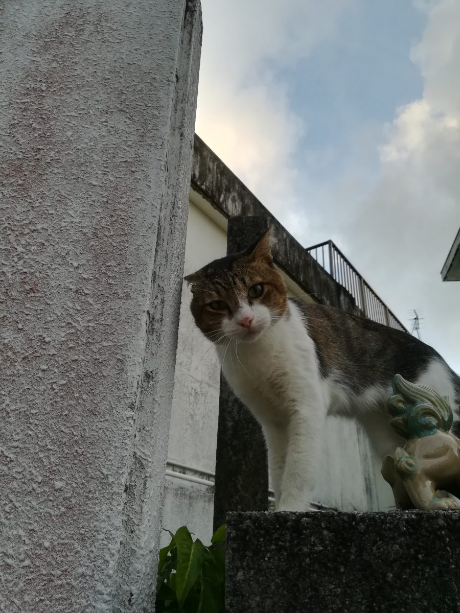 門柱のシーサーと仲良しなおニャン子 2018/9/15 2018/10/25 崎山ハイツのおニャン子 門柱の上にシーサーが乗っている場所がお気に入りなのか、シーサーがお気に入りなのか… ここを通ると、このおニャン子がよくこの場所に座っています。