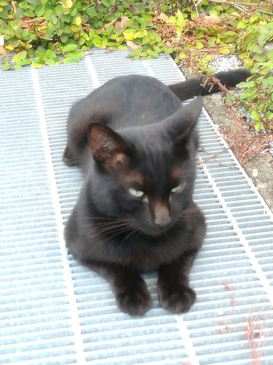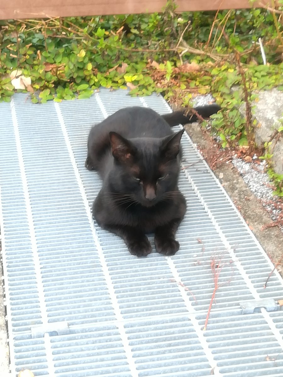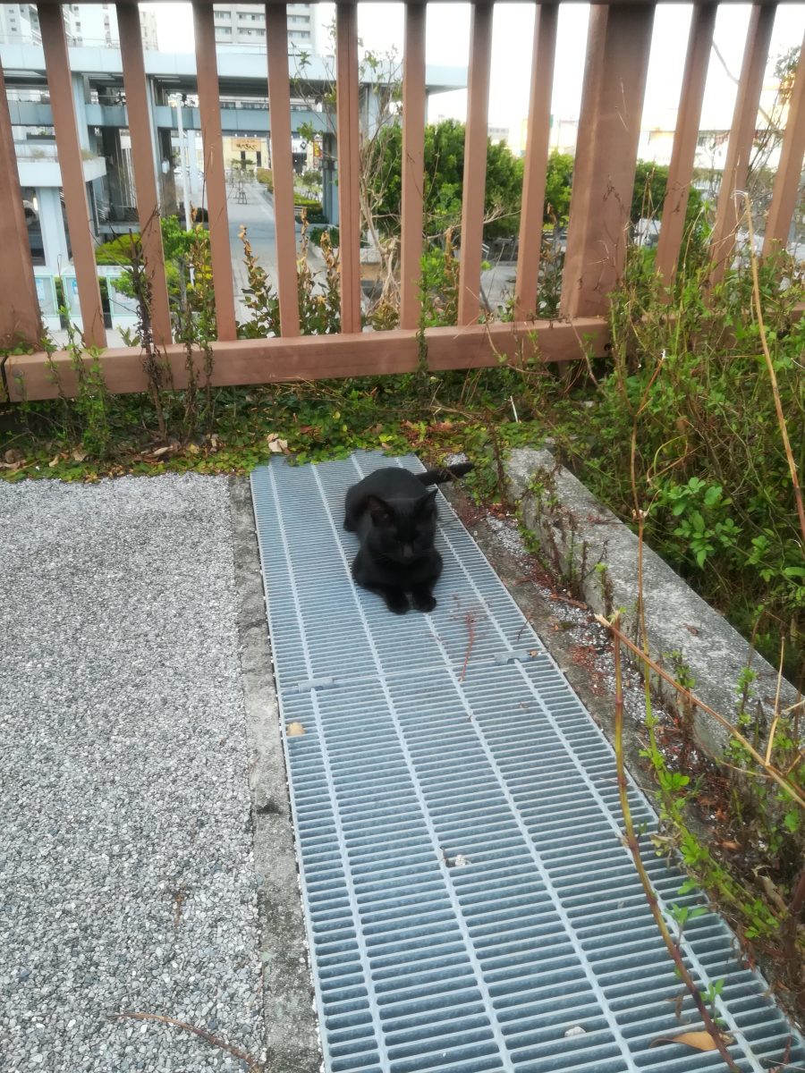 新都心公園の黒猫 2018/10/9 2018/10/25 新都心公園のおニャン子 新都心公園があるおもろまちの中央を走る、那覇中央環状線に、博物館側と、沖縄総合事務局側にかかる、歩行者用の橋の上に、真っ黒な猫が座っていました。 「にゃ~オ」と、挨拶して近寄ってゆきましたが、近寄りすぎると逃げてゆきました。 多少は、人間慣れしているようですが、警戒心は放棄していないようです。