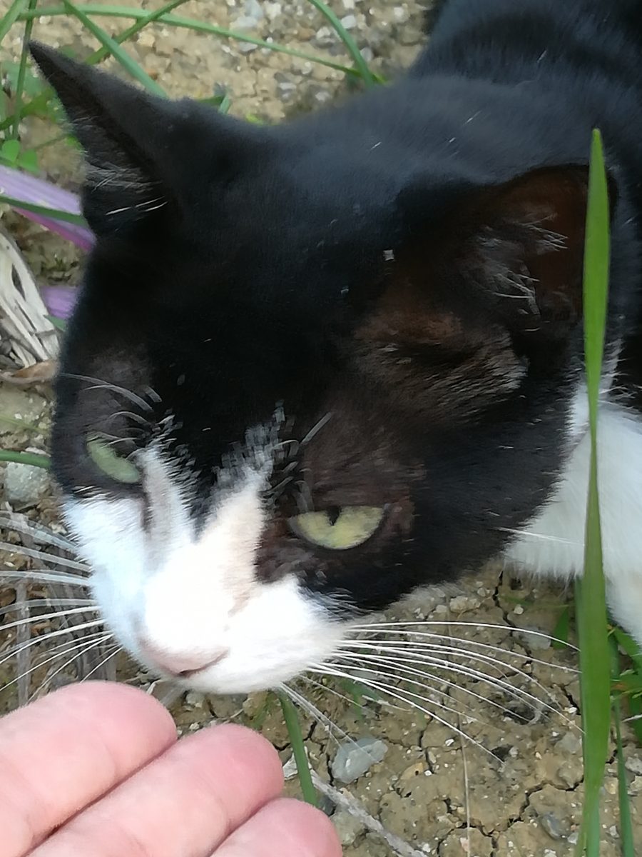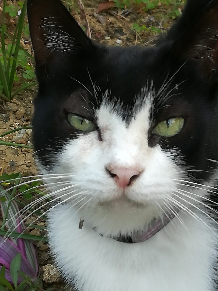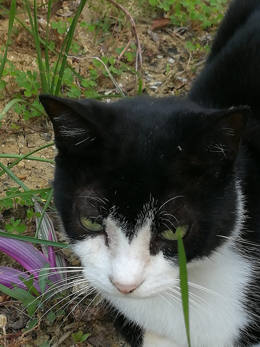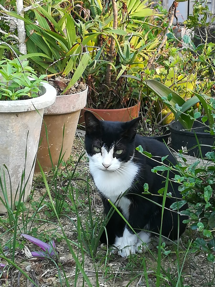 崎山ハイツの中にある大きな亀甲墓付近で時々見かける、鼻にV字模様がある、白黒のおニャン子に遭遇しました。