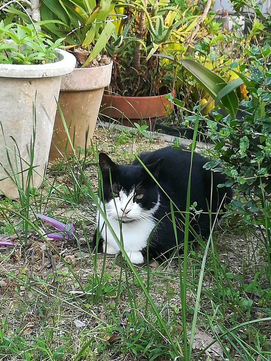 首輪をしているので、飼い猫のようです。何度か遭遇しているので、警戒を解いたのかもしれません。