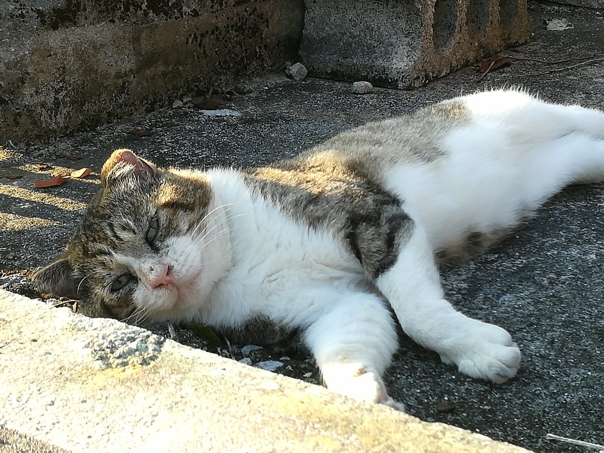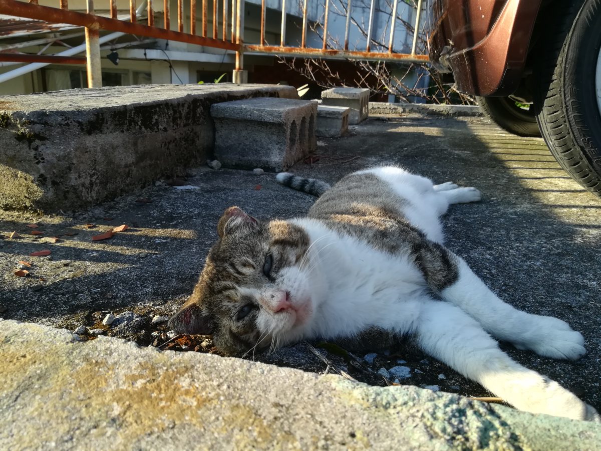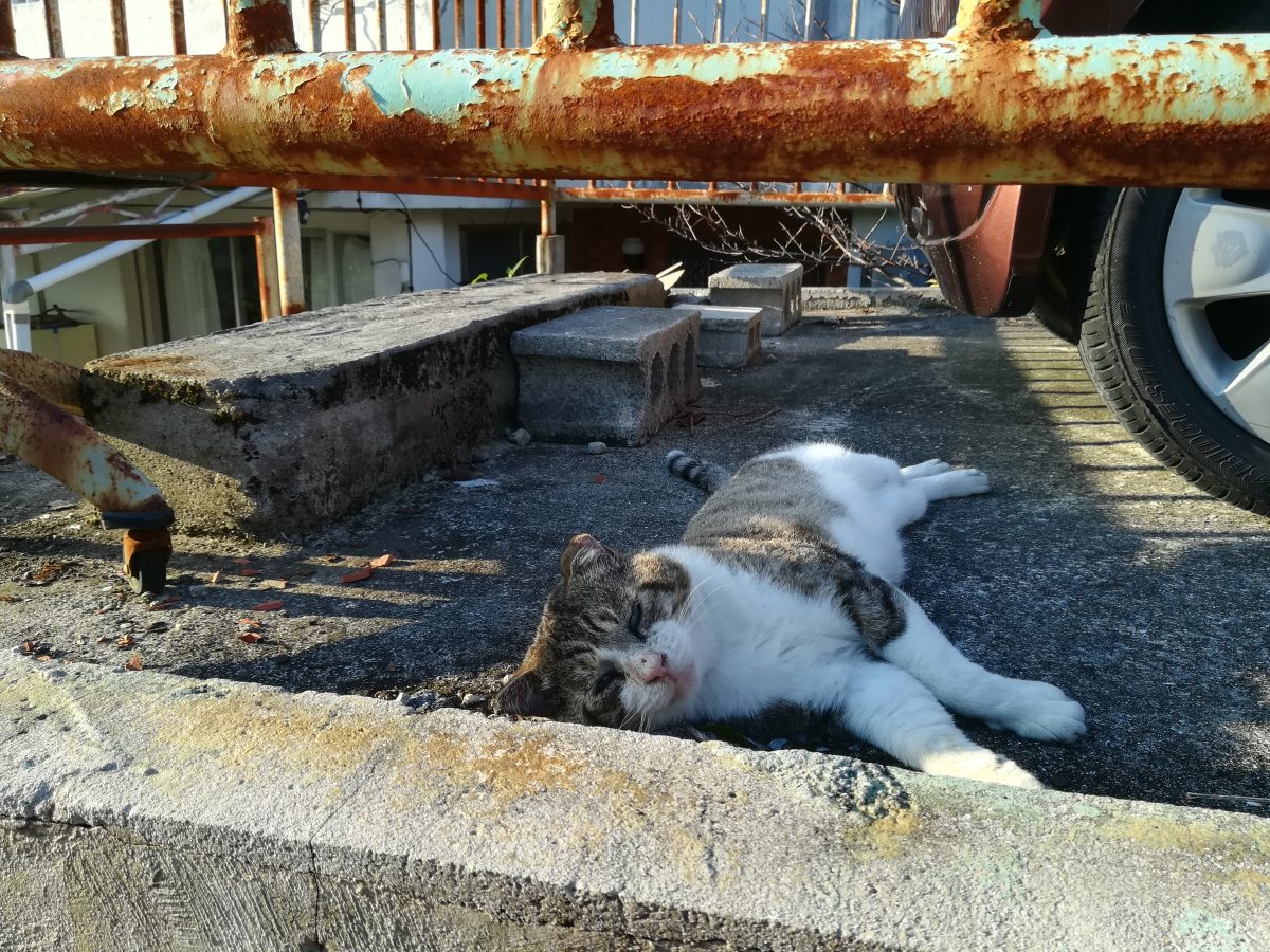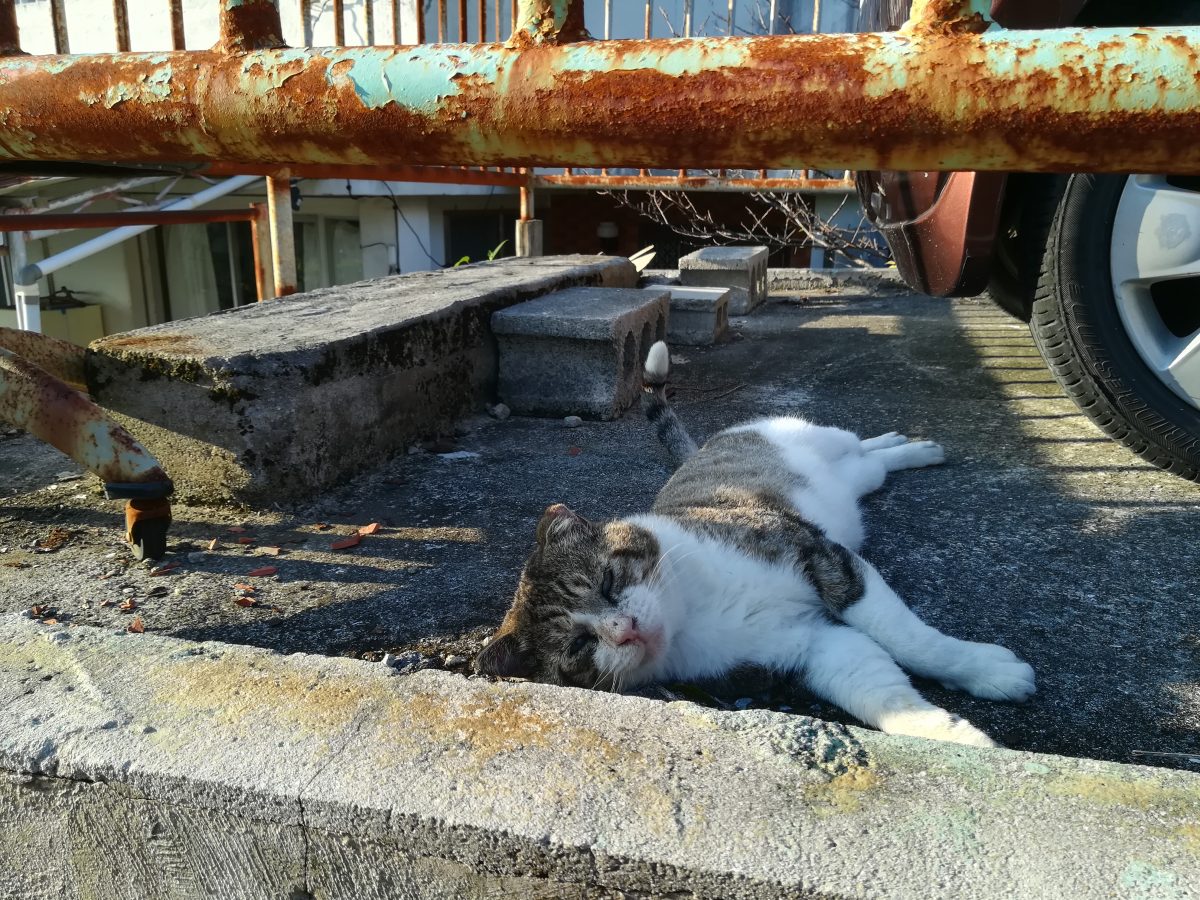 車の横でお昼寝中のおニャン子 2018/11/11 2018/11/12 崎山ハイツのおニャン子 お昼寝中の強面おニャン子に会いました。 近寄ってゆくと、こちらの気配を察したのか、しっぽをふりふり喜んでいたようでした?