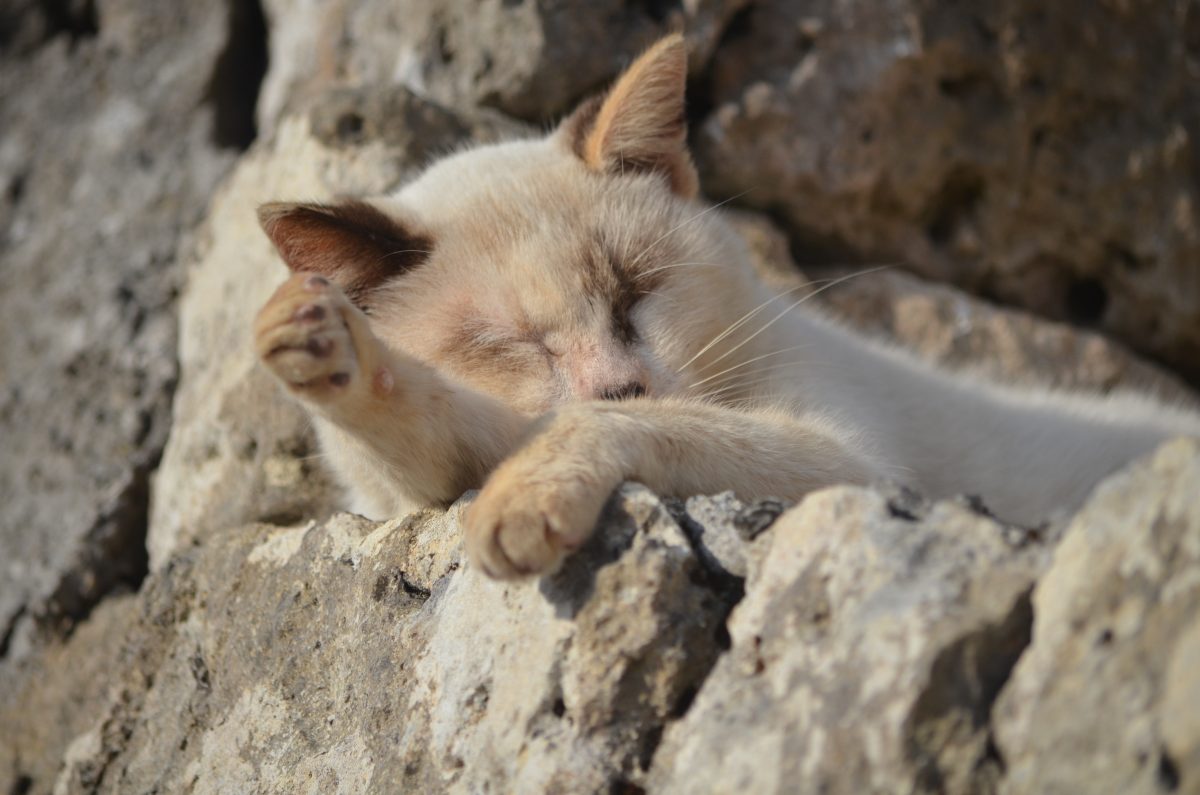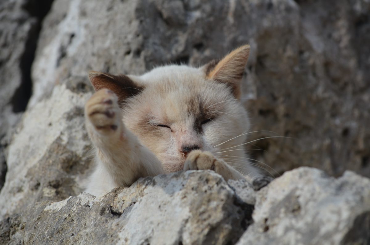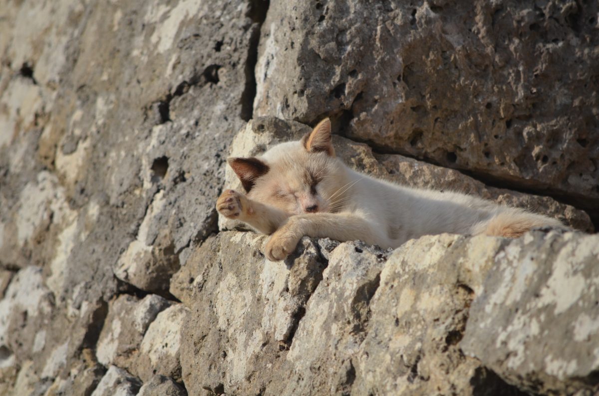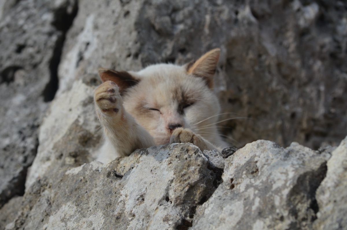 首里金城町石畳側道の石垣でくつろぐおニャン子 2020/1/11 那覇市 首里金城町の石畳に続く側道にある民家の石垣の上でくつろいでいるおニャン子 手を伸ばして届くかどうかというくらいの高さの石垣だったので、近づいていっても、平気でした。