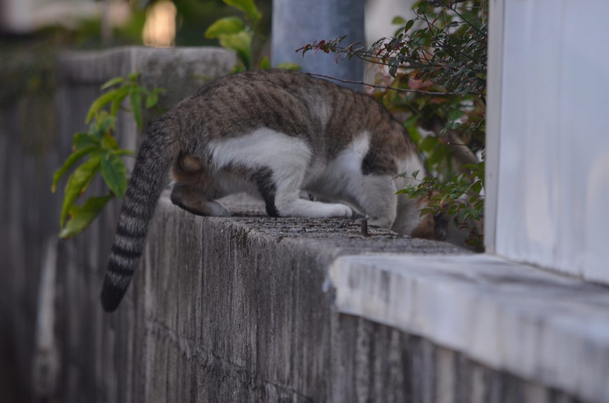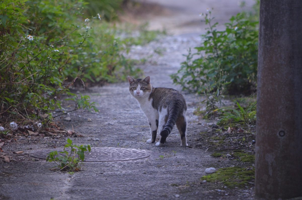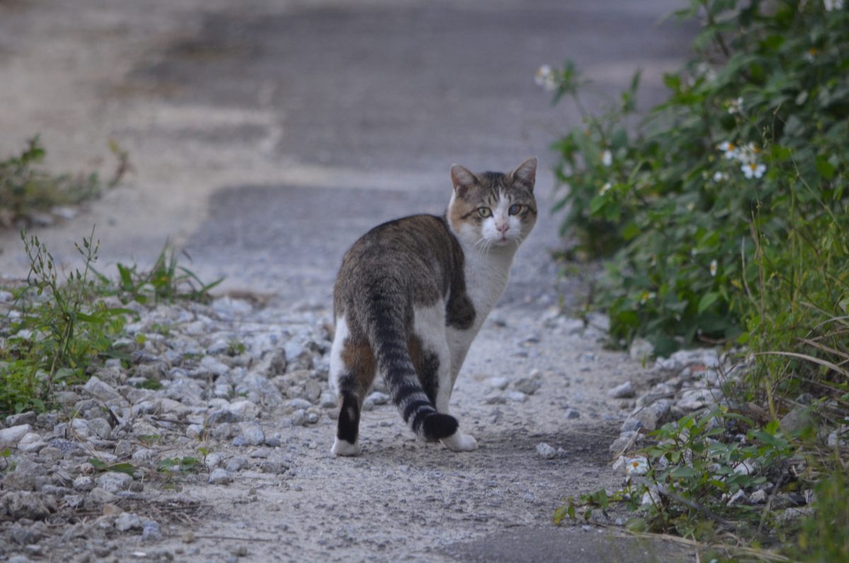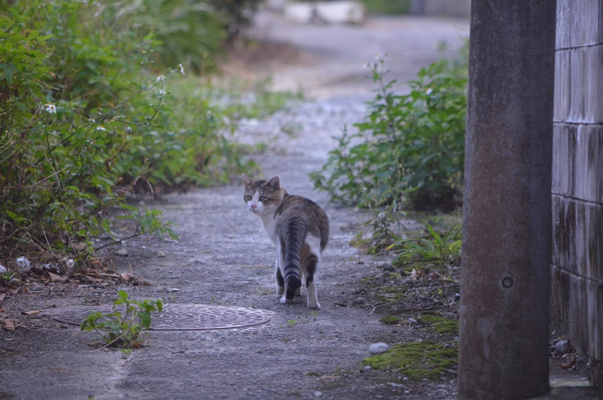 織名の路地を歩いていたおニャン子 2020/1/11 那覇市 織名の町をブラブラ。細い路地でおニャン子発見。 かばんからカメラを取り出すと警戒して、逃げていく。 猫声で「にゃーお」と、呼ぶと、こちらが気になるのか、振り向いてくれた。