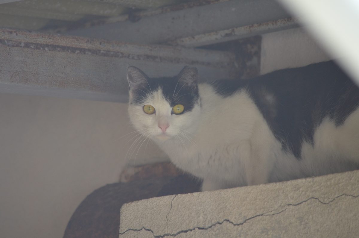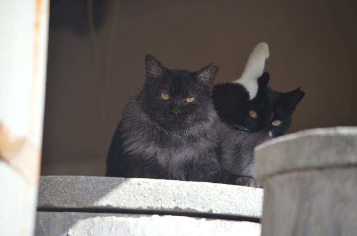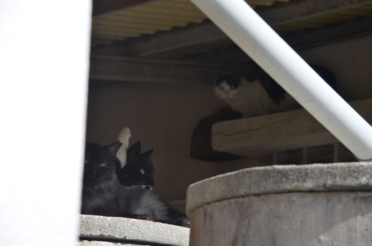 屋根の下にあるタンクの上にいたおニャン子たち@与那原町与那原 2020/1/15 2020/1/16 与那原町 屋根の下にコンクリート製のタンクが設置されている場所で、おニャン子たちがくつろいでいました。 2匹が毛づくろいをしていると思ったら、その奥にもう一匹おニャン子がいました。