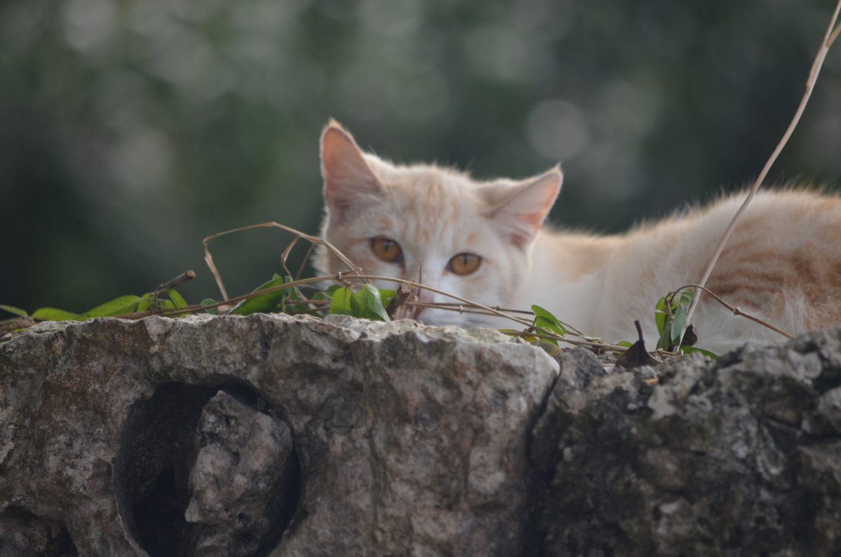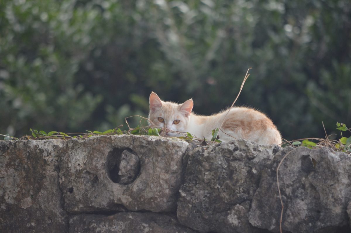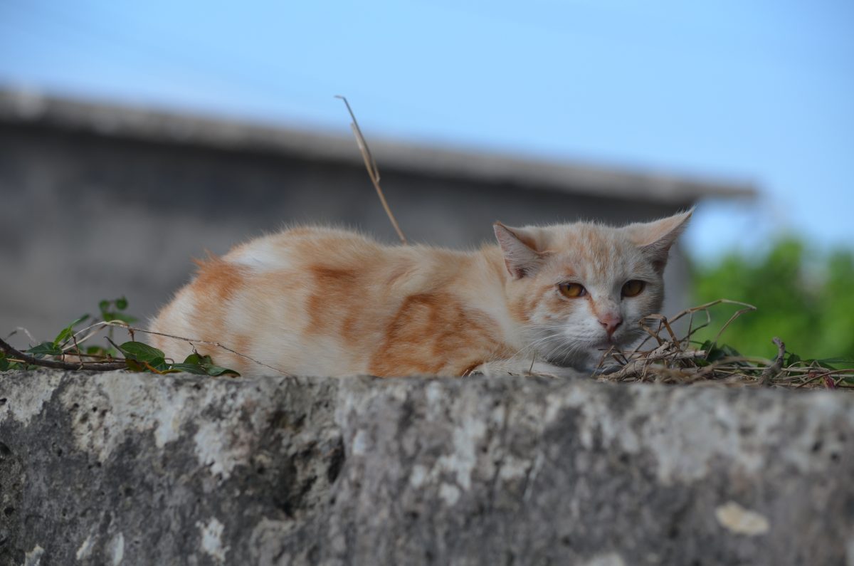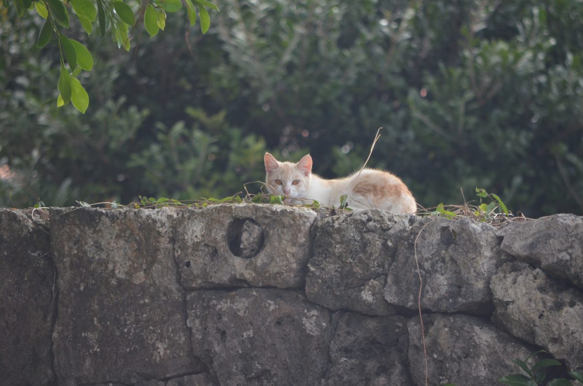 石垣の上でくつろいでいたおニャン子@糸満市喜屋武 2020/1/26 糸満市 糸満市、喜屋武集落をぶらぶら。 民家の石垣の上でくつろいでいるおニャン子を発見。市販のコンクリート製のブロック塀に比べると、琉球石灰岩を積み重ねた石垣は、天辺の幅があるので、くつろぎやすいのだろう。 また、高いところにいるので、こちらが近づいていっても、逃げようとはしなかった。