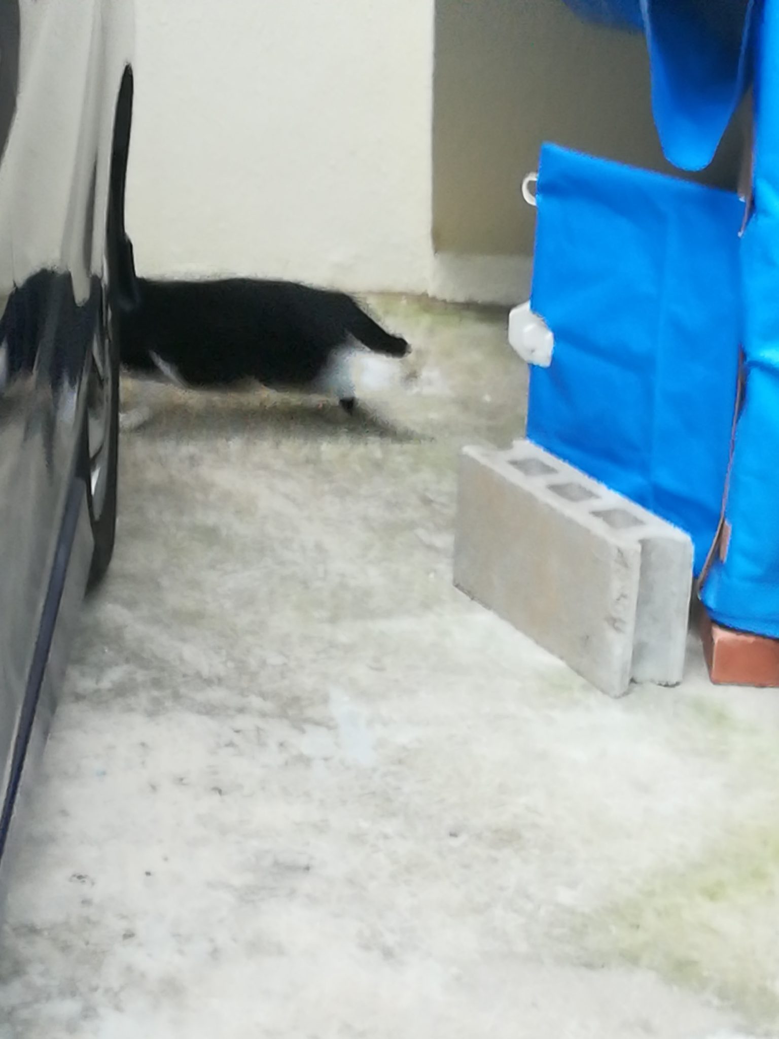 2017年12月18日(月曜日)の早朝7:45頃、飼い猫用のエサの残りを漁る、崎山ハイツおニャン子クラブ・会員番号6番の白黒の猫を発見。