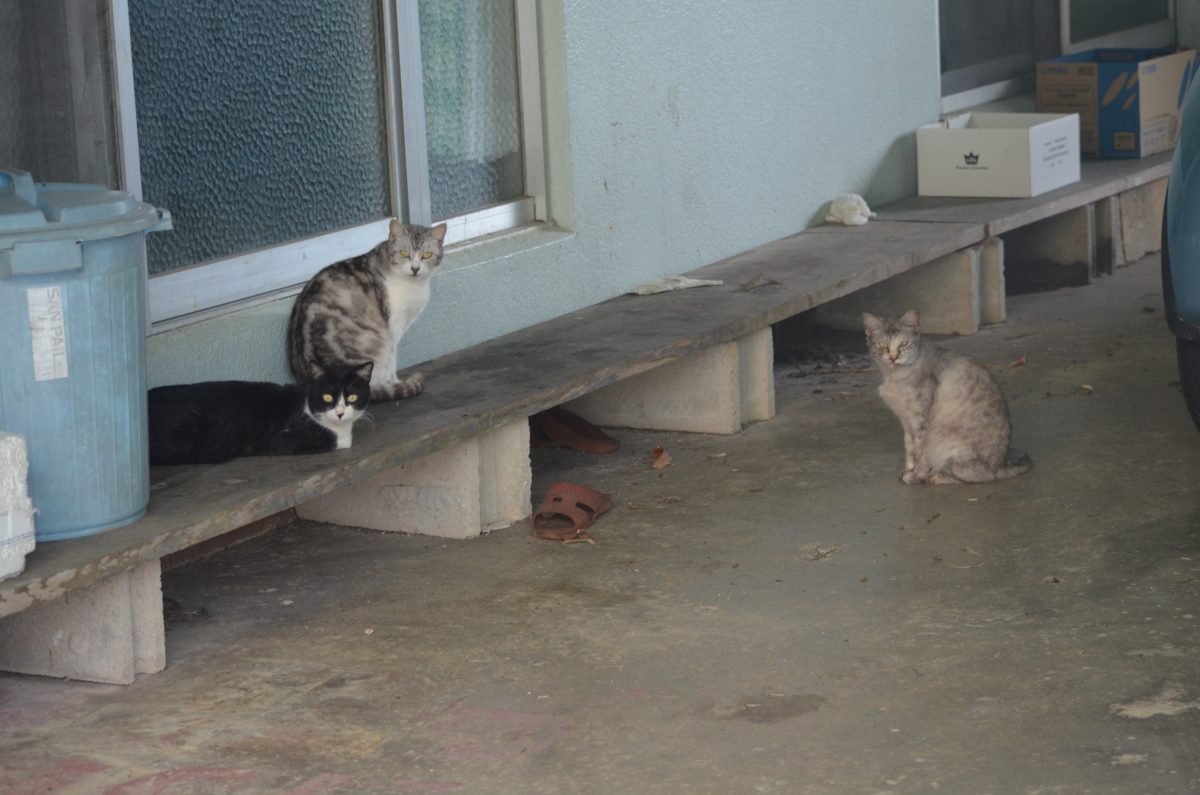 豊見城市長堂:3匹でつるむおニャン子 2020/4/3 豊見城市 豊見城市長堂の民家の駐車スペースで、飼い主が餌を出すのを、窓の傍で待っているおニャン子たち。 こちらが「ニャ~オ」と、呼びかけると「???」とした表情で私を見つめていました。