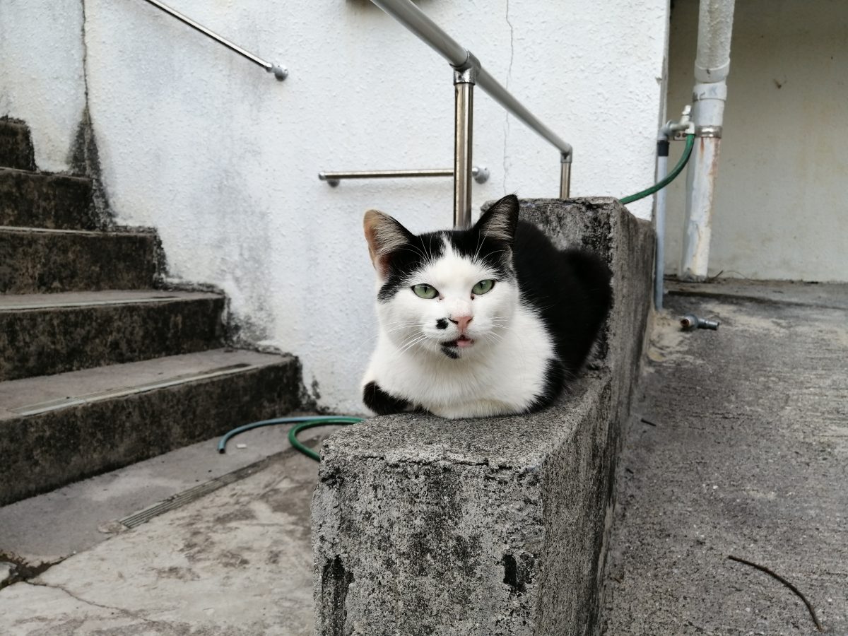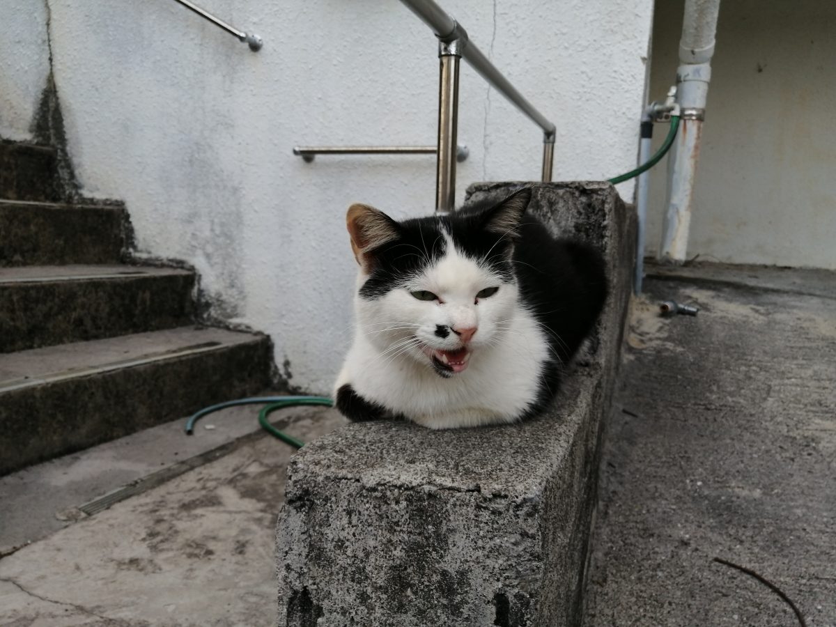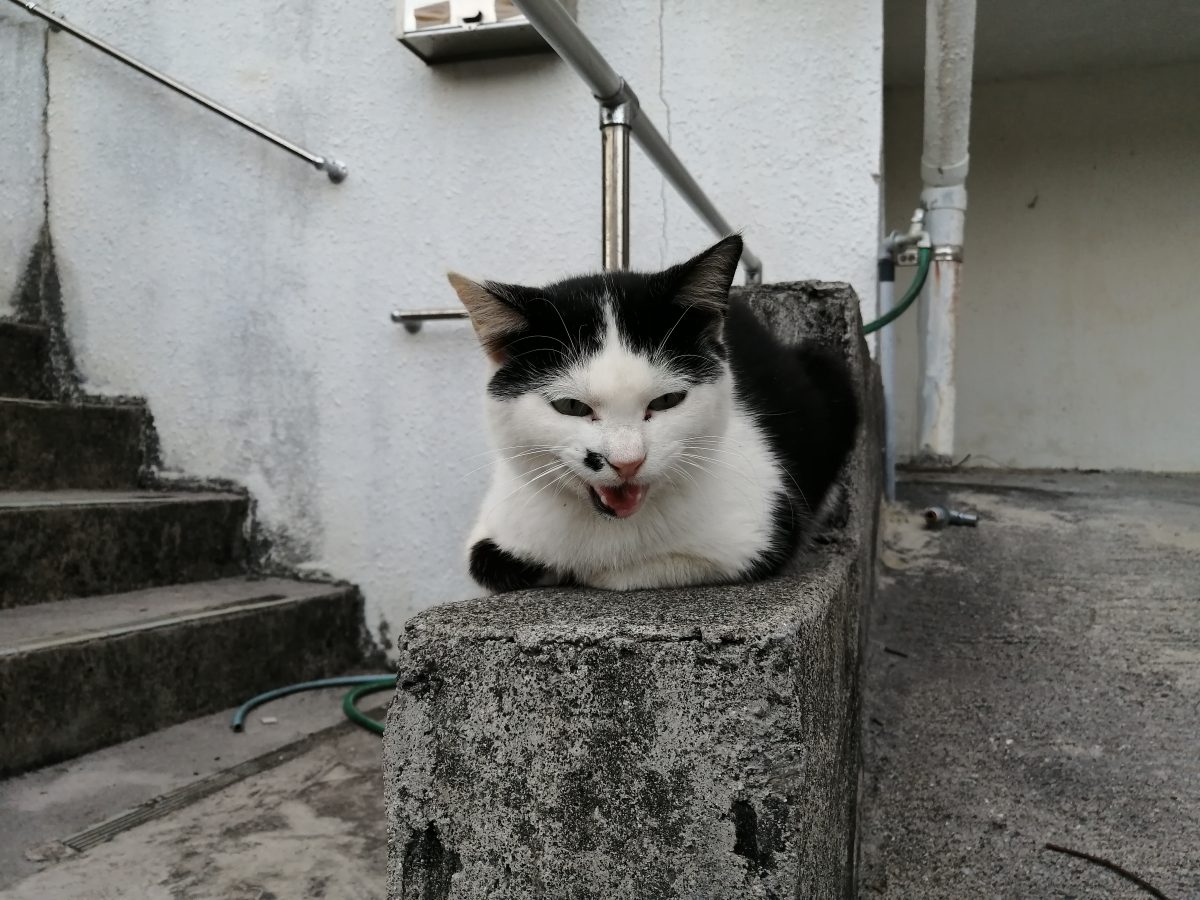 人馴れしたおニャン子@南風原町兼城 2020/4/3 2021/7/24 南風原町 南風原町兼城の急勾配の坂道の途中にある民家の壁の上で、ツートンカラーのおニャン子に「ニャ~オ」と、挨拶すると、おニャン子も「ニャ~オ」と返事をした。 近寄っても逃げないし、スリスリしてくる。近所の人たちから餌でももらっているのだろうか?