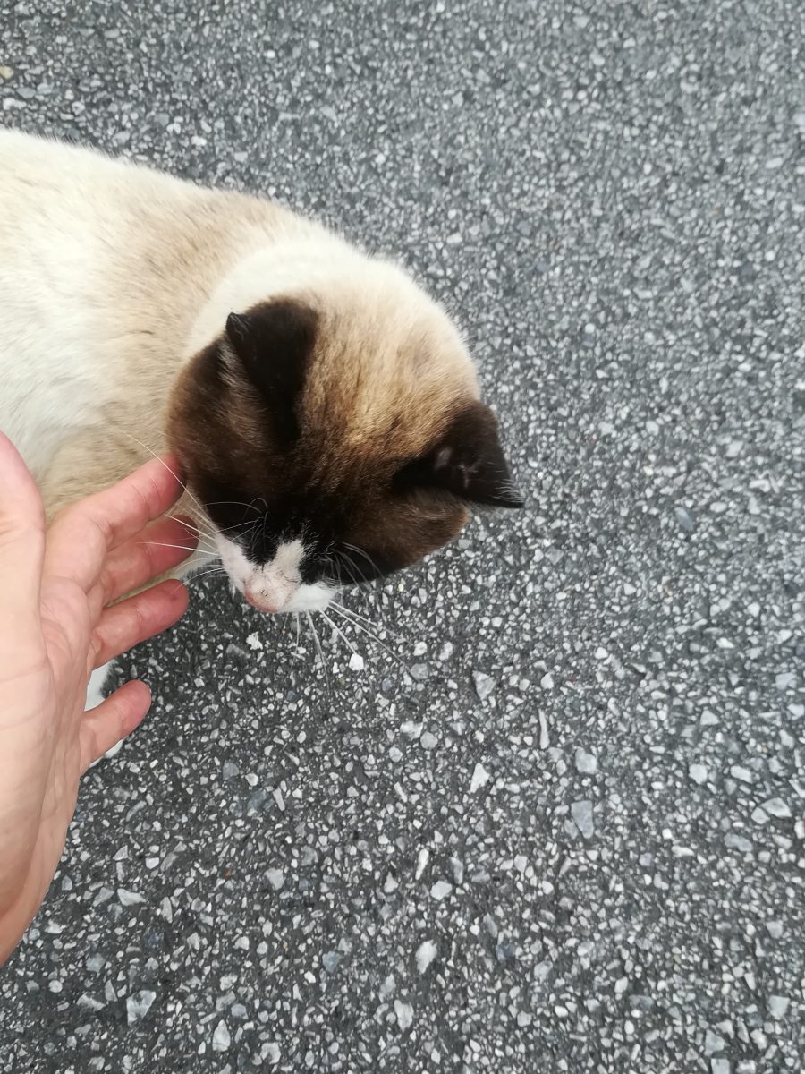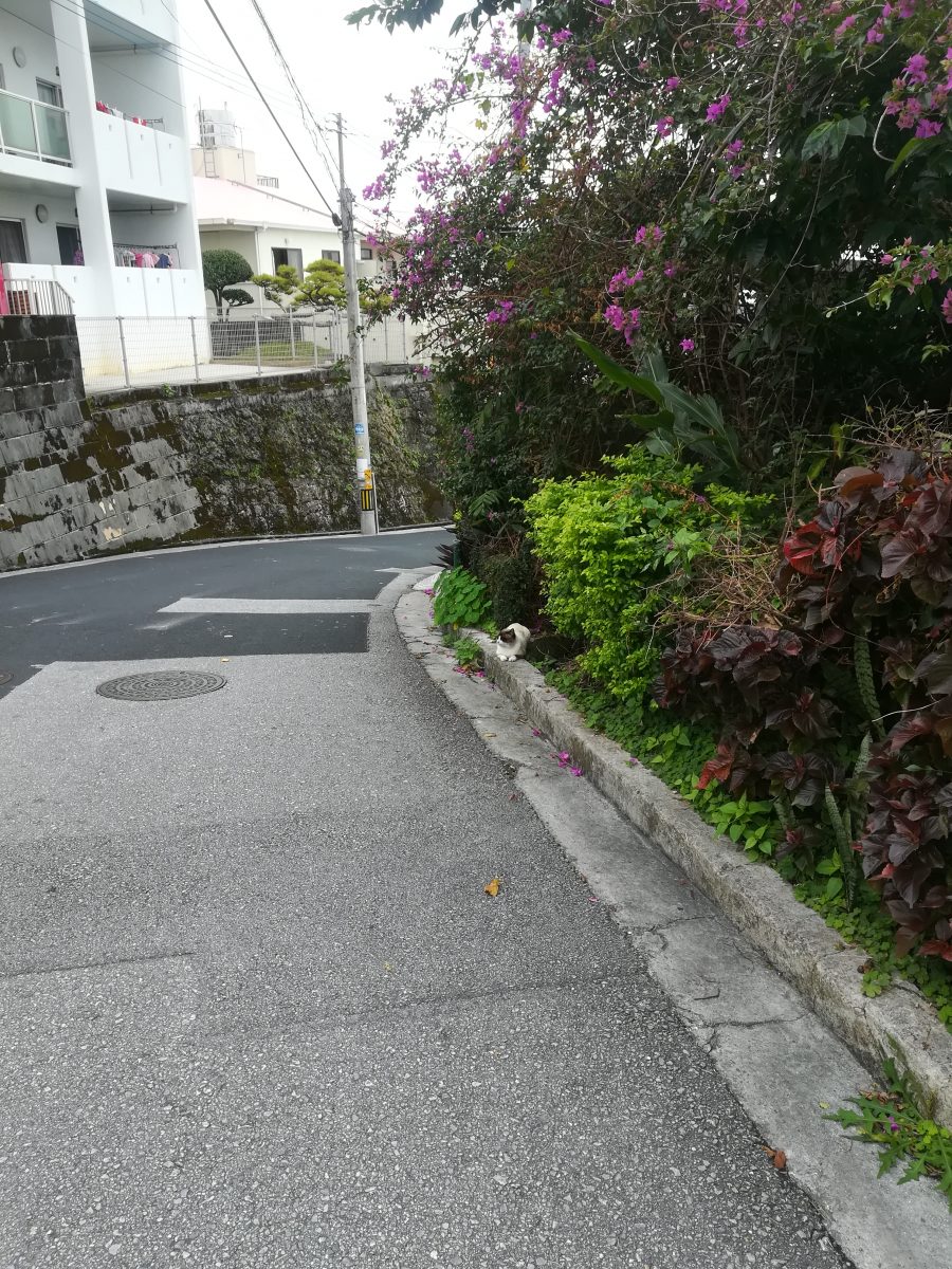 崎山ハイツの中を歩いていると、崎山ハイツのシャンシャンこと会員番号1番のおニャン子が道路の路肩のコンクリートの上に座っているのを発見しました。