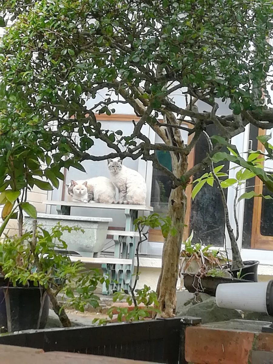 こんな雨の日、おにゃんこたちはどうしているのかな?と、考えながら歩いていると、いつも1~2匹のおニャン子が台の上にすわり、ご主人様?もしくは、エサ?を待っている場所を覗いてみると、なんと、3匹のおニャン子たちが仲良く、寄り添うように座っていました。軒下で、雨が直接当たらない場所のようです。
