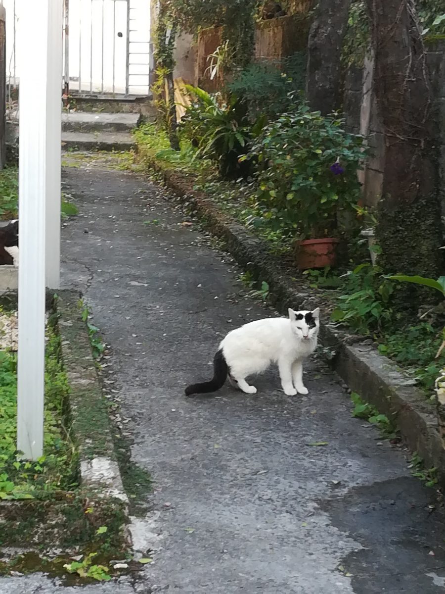 ほかに、白毛の黒が所々にあるおニャン子は、こちらを警戒して、木に昇って、屋根の上からこちらの様子を観察していました。