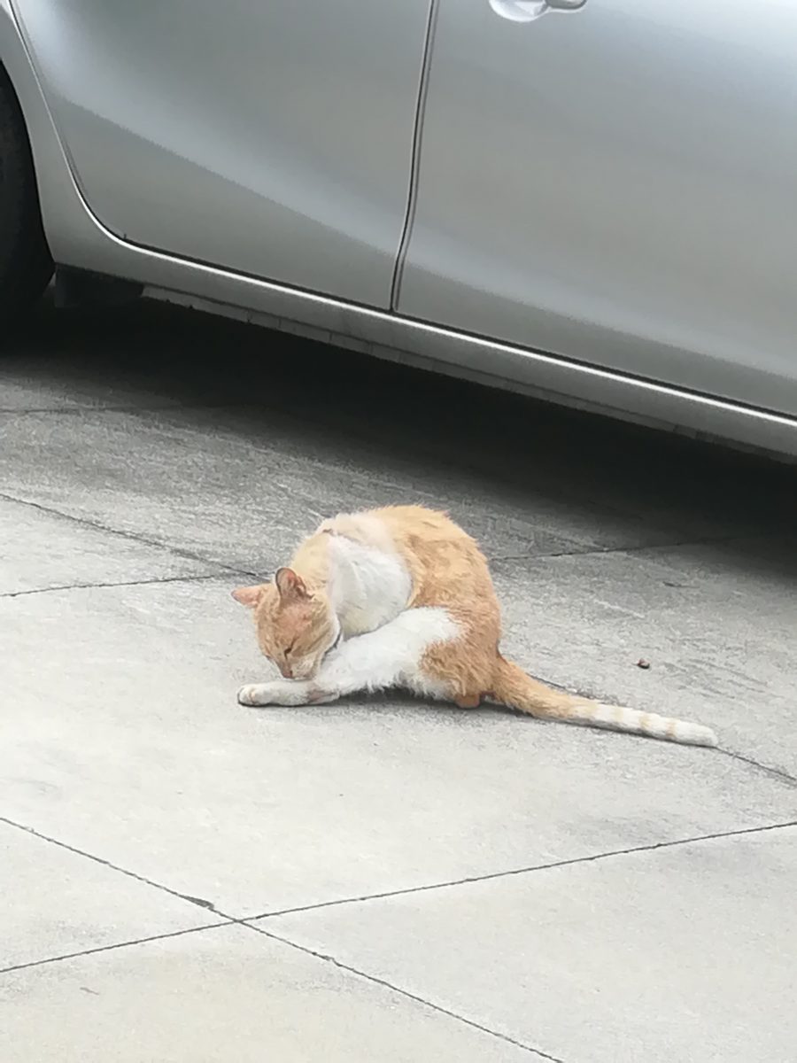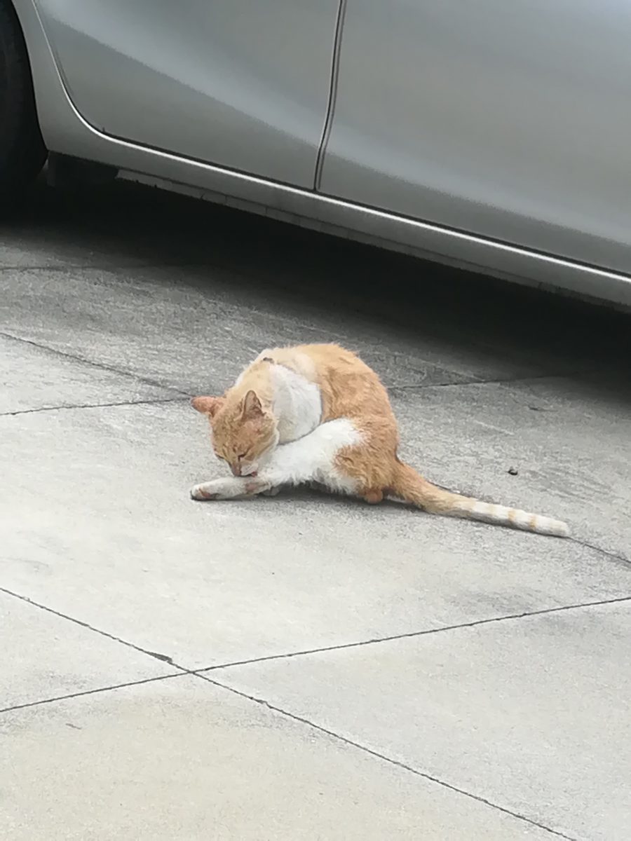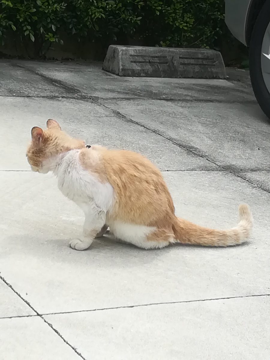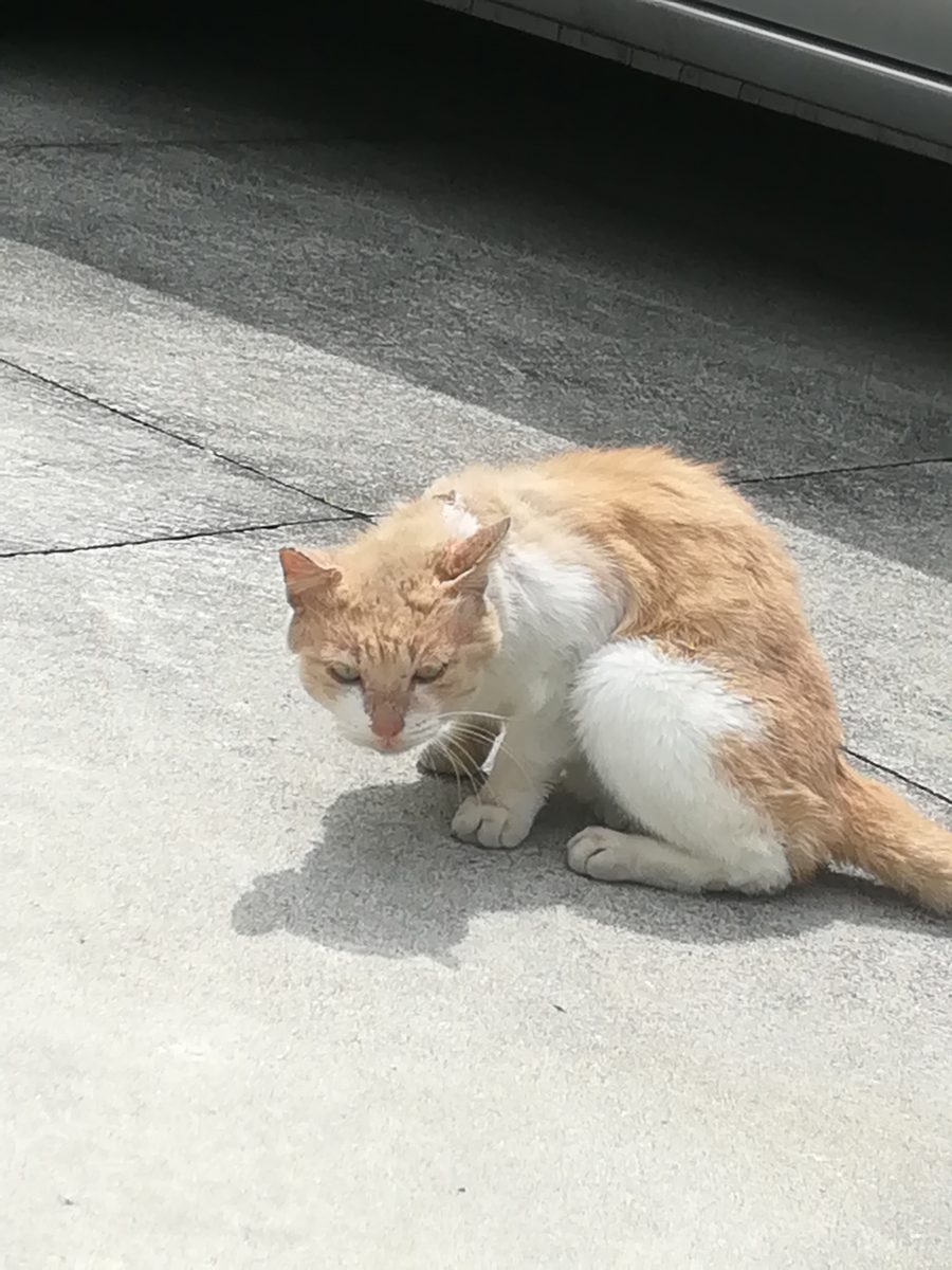 崎山ハイツ外れに近いところで、これまで、入ったことのない路地を散歩していると、怪我をしている茶色のおニャン子に遭遇しました。