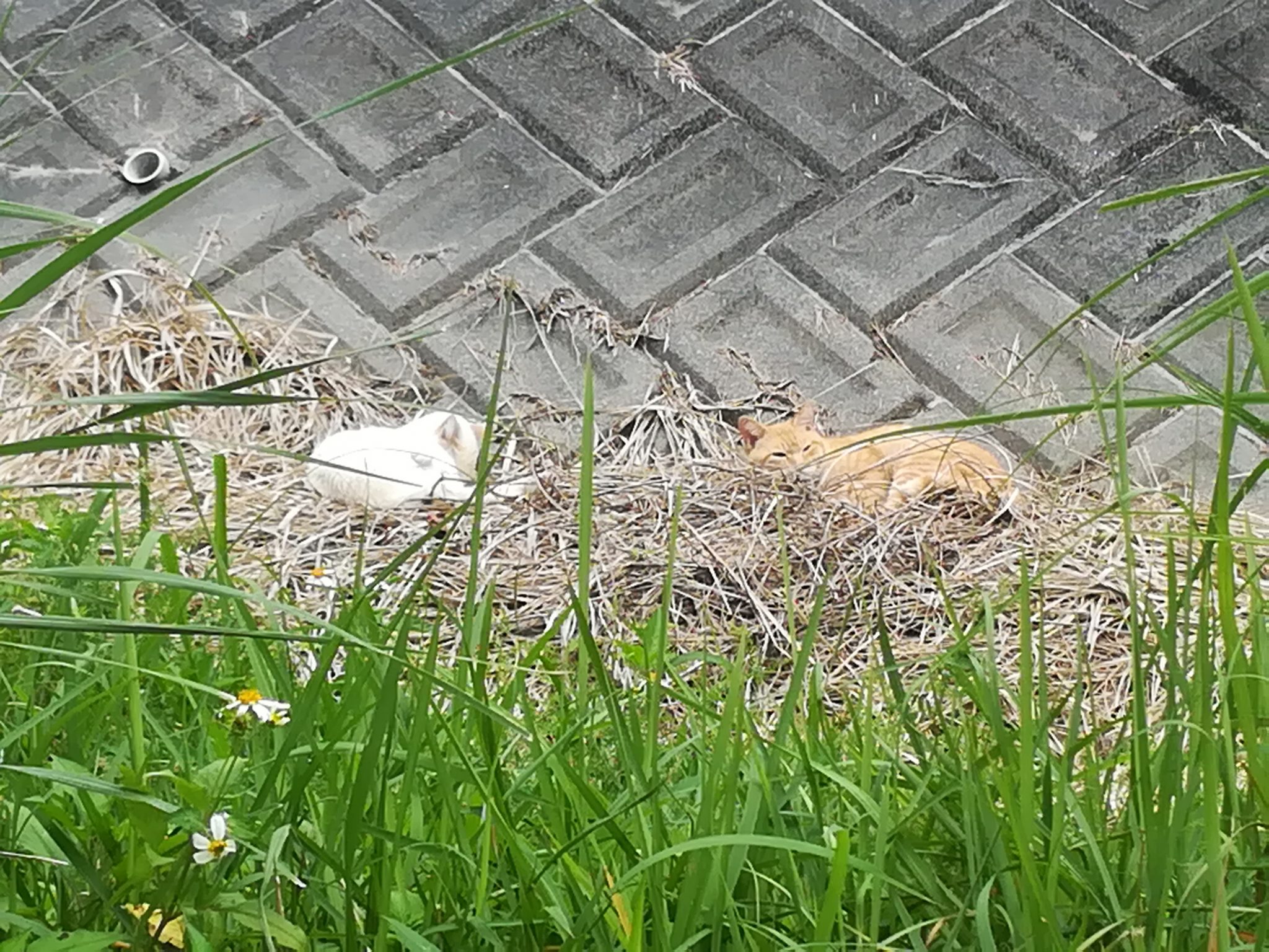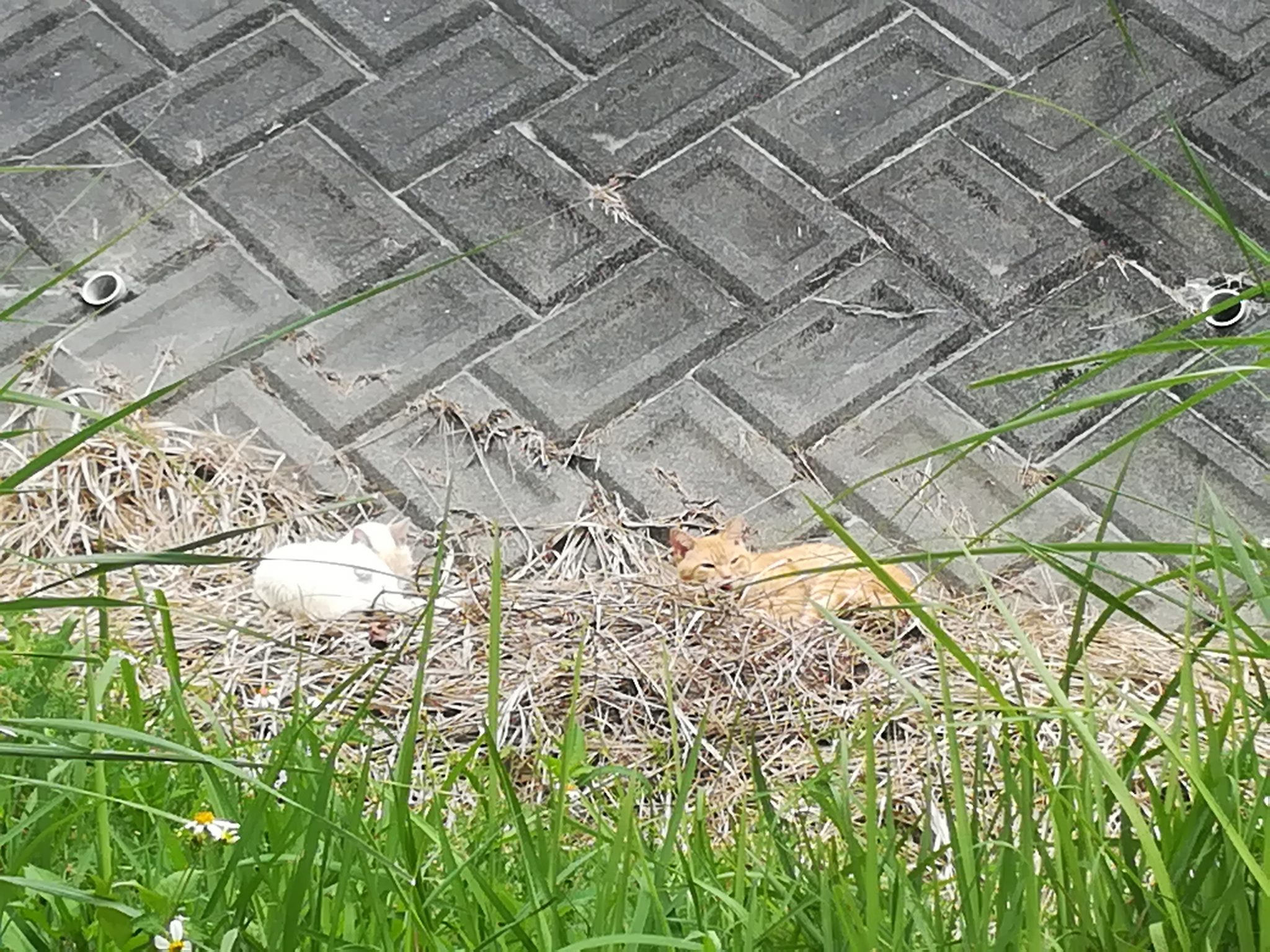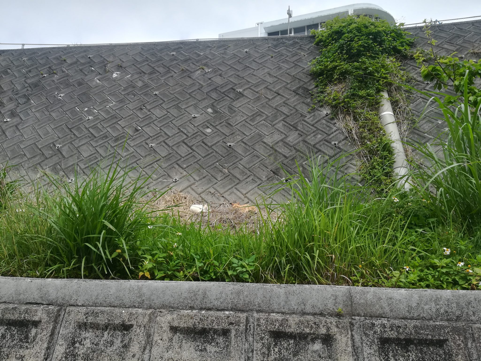 首里カトリック幼稚園の南側の崖の下が土手になっているのですが、そこの枯れ草の上で二匹のおニャン子が日向ぼっこをしていました。