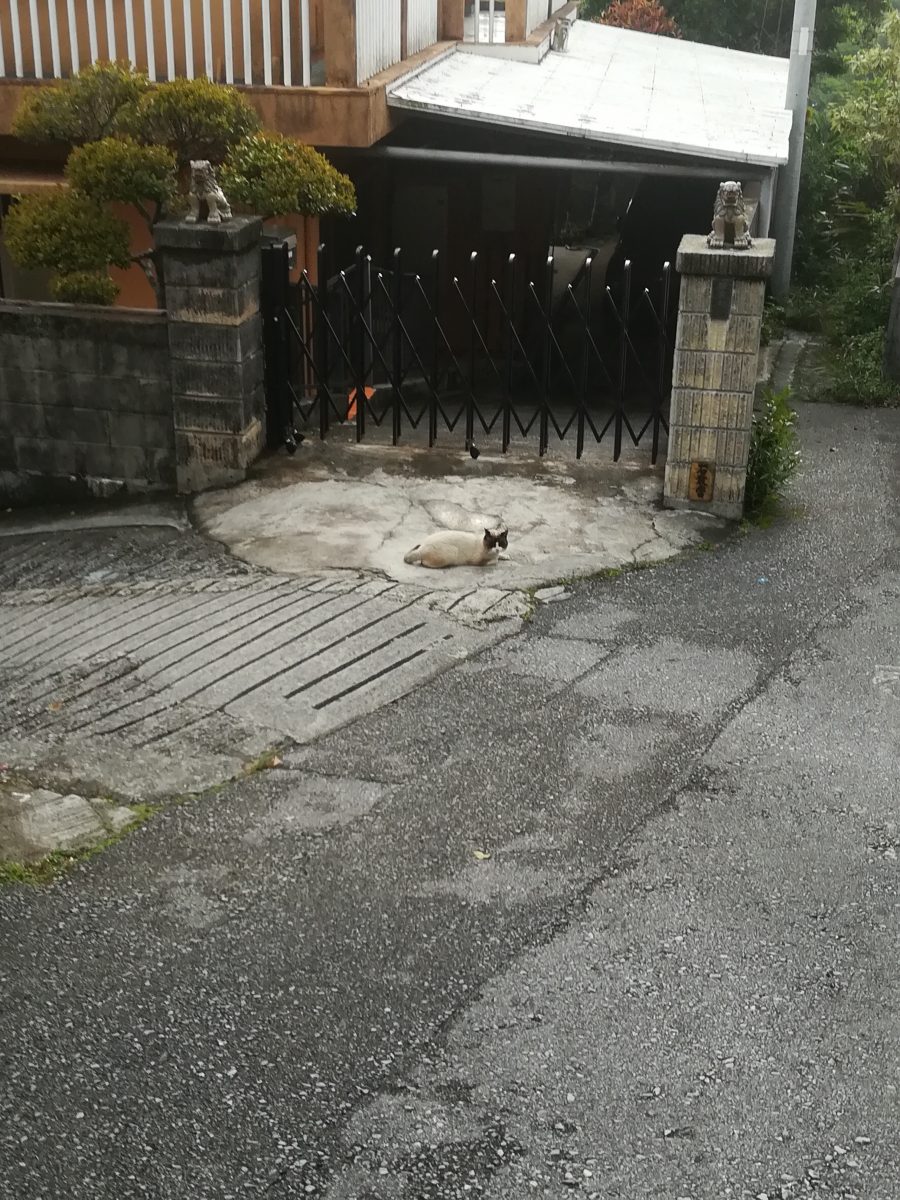 土曜日の夕方、日が沈む頃、崎山ハイツの中を散歩していると、交通量の少ない路地の駐車場で、シャンシャンがゴロンゴロンしているのを発見。