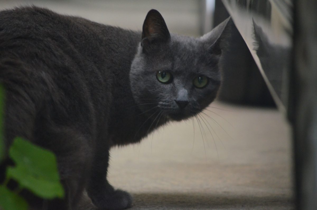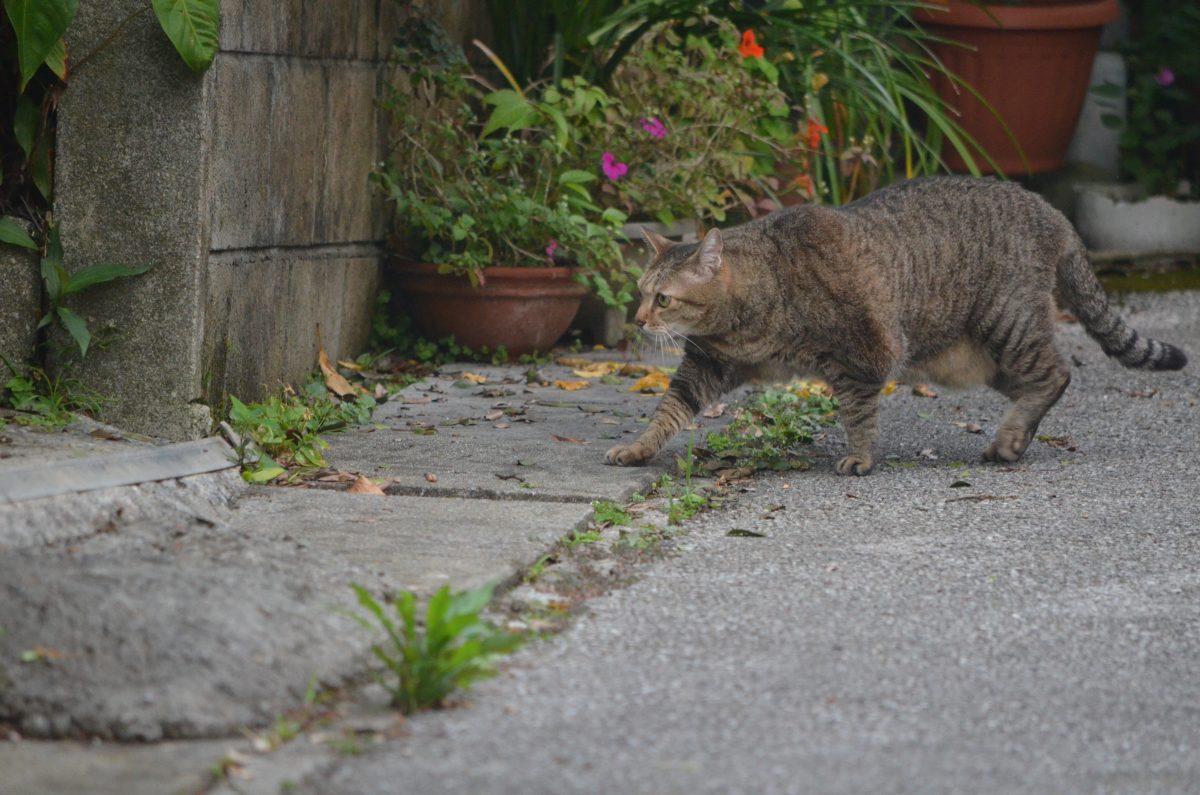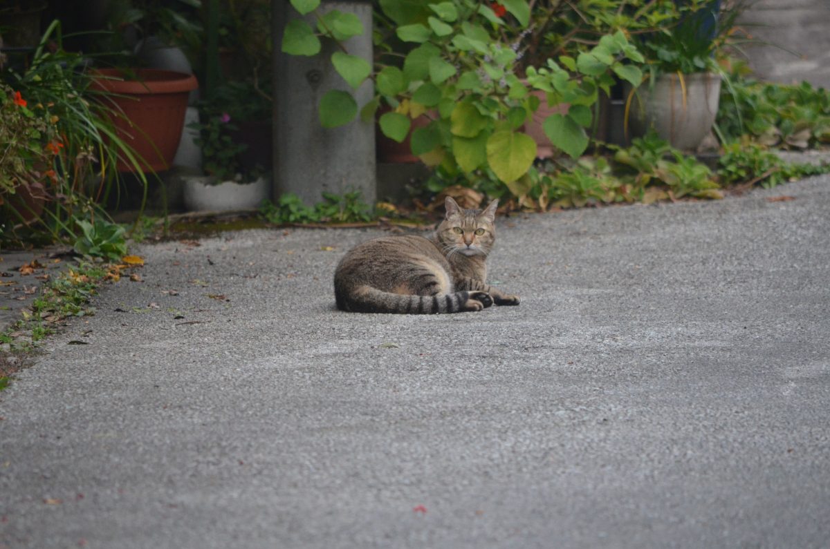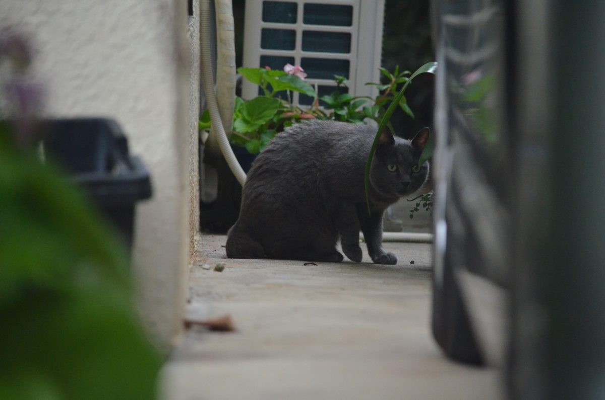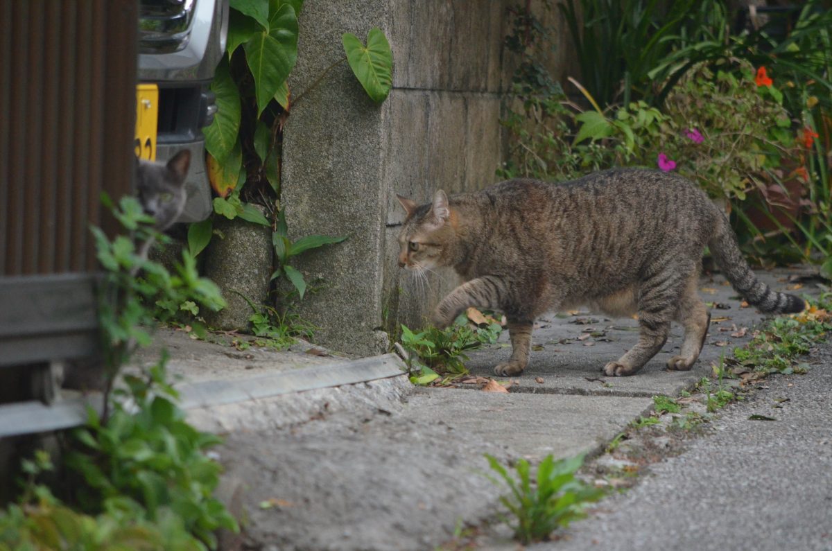 車の陰に隠れてこちらの様子を伺うおニャン子たち 2018/4/14 2018/4/16 崎山ハイツのおニャン子 黒いといっても、真っ黒ではなく、少し青みの入った、勝色のような毛をしたおニャン子を見つけました。 駐車場の車の側にいたのですが、ニャ~オと挨拶すると、奥の方へ移動してゆきました。 この駐車場には、もう一匹、トラ模様のおニャン子もいました。 道を歩いているのを見つけ、「ニャ~オ」と、挨拶したら、同じ車の方へと移動してゆきました。